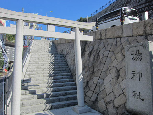 道後温泉本館を一周していたら鳥居が見えます。近代的な石の階段を上っていくと湯神社に着きます。境内はそれほど大きくありませんが、菓子協会が寄進した建物や○○タルトの文字が刻まれた石柱があり意外と面白い発見があります。
