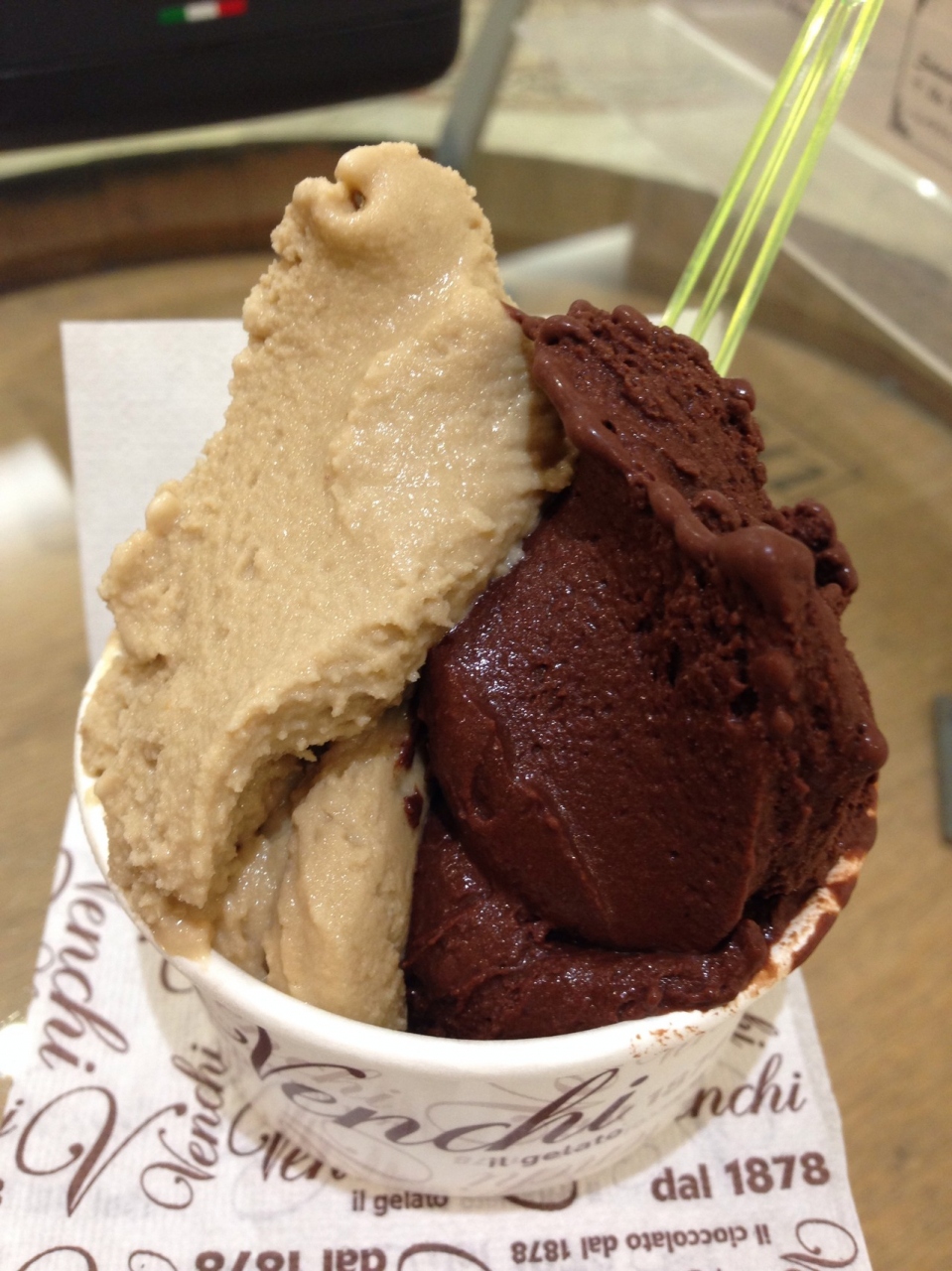 イタリア高級食材スーパーのイータリー、東京都心だと小規模な店が多いですがココはかなりゆったりめ。イタリアのチョコメーカー、ヴェンキのジェラートは簡単なテーブル席でゆっくり座って味わえます。2種類盛りで500円と高級ですがカカオの風味がしっかりあってとても美味でした。