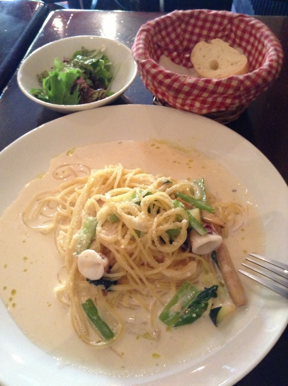 ツナとヤリイカのクリームソースパスタを注文。これに、小さなパン、サラダがついてきます。