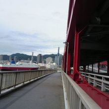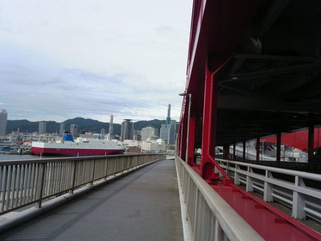 人工的に作られたポートアイランドと本土をつなぐ為に出来た橋。上下にわけて車が一方通行に走る作りです。多くの車が行きかいますが、歩道もあります。メイン歩道の東側と合流する西側の歩道は階段があり無理ですが、東側は自転車も通れます。
