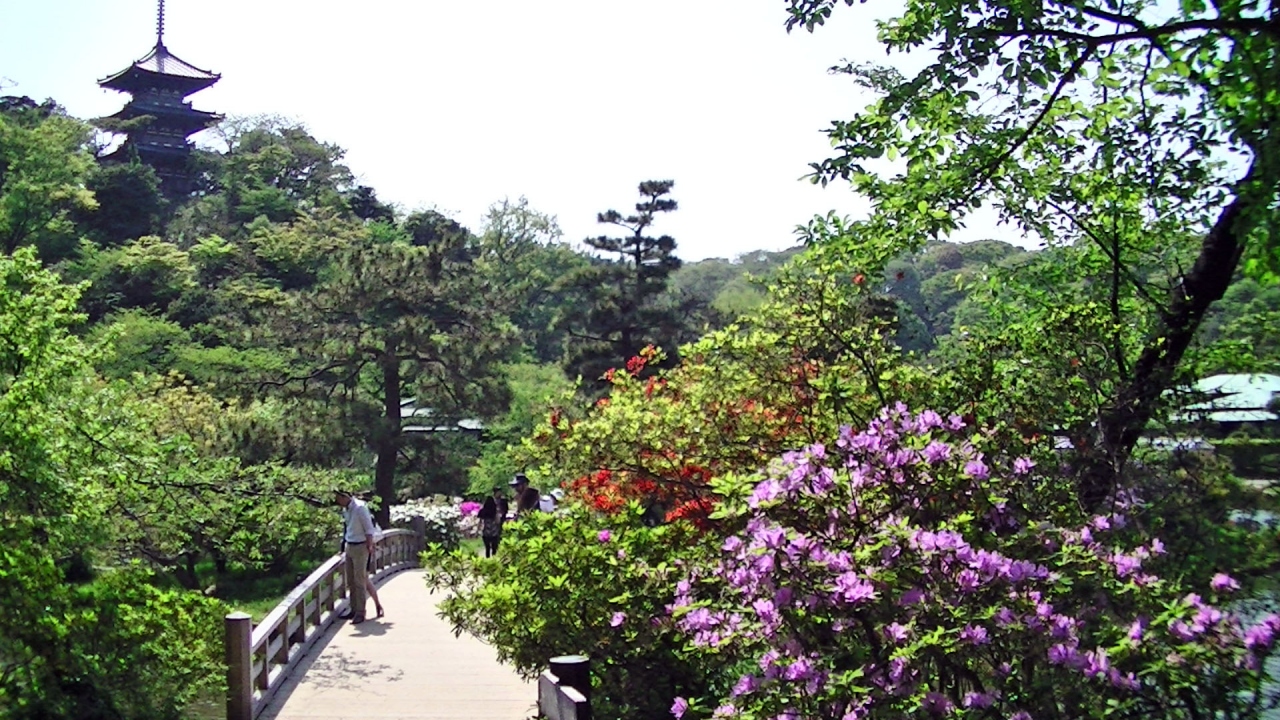 広々とした日本庭園には四季折々の花が咲き、園内の歴史的建造物と調和してみごとです。