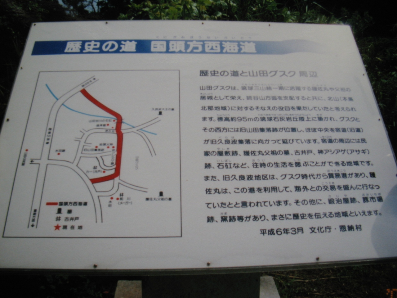 城跡の中腹には護佐丸の祖父一族の墓があり、近くには、“歴史の道・国頭方西海道”が通っています。海道の周辺は亜熱帯植物が茂り、石畳や急坂などがあるので、歩き易い靴で散策されるのがよいと思います。