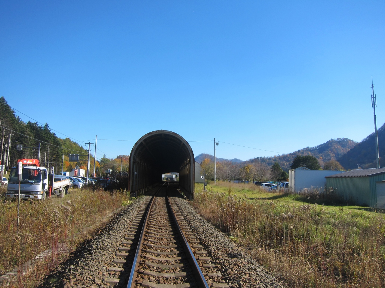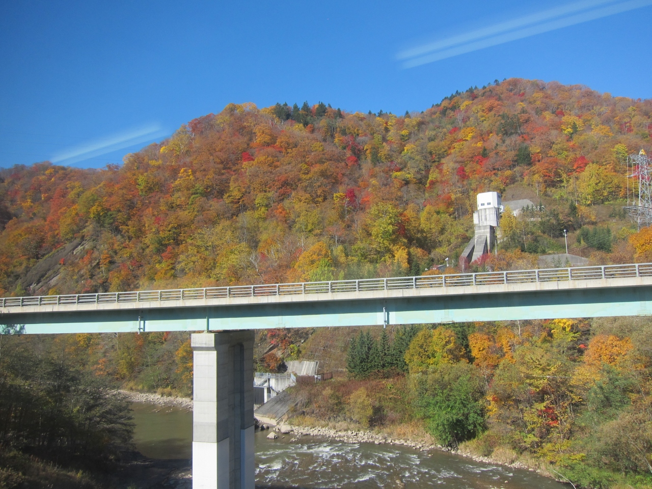 ただ、駅は列車の本数が少なく、公園へのアクセス手段としては不便かもしれません。ほとんどの人が車で訪れています。しかし、列車からの景色も捨てがたいです。川端駅~滝ノ上駅は夕張川の渓谷を越えます。ここも紅葉です。列車を利用した際は、同区間のみ観光バスの団体客が乗ってきました。ツアープランに入っていたようですが、それも納得の景色です。道路からはここまでは見えません。満員の車内では歓声が轟いていました。