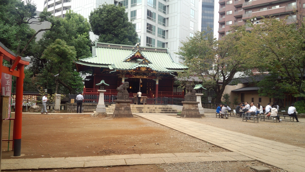 渋谷警察署の裏にある周りは高いビルに囲まれた都会の神社です。渋谷のパワースポットと言われているところで、かつては数カ所に湧水があり、周りとは違った気が流れている場所です。訪れた時間がちょうど昼休み時間であったため、付近のサラリーマンがベンチに座って、パワー充電のため休んでいました。またこの神社の「御朱印」は達筆で有名で、御朱印帳にいただいてきました。