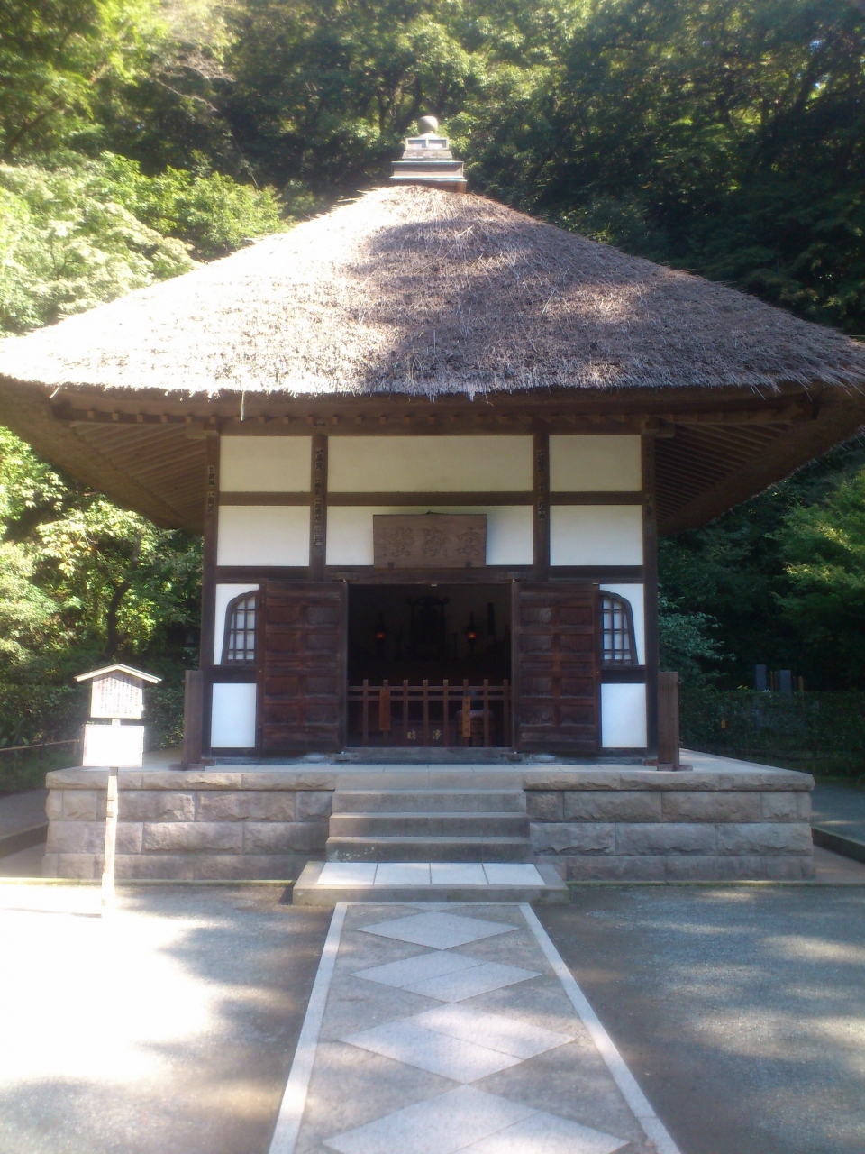 明月院の奥の方にある茅葺のお堂です。もともとは、宗猷堂と呼ばれていたようです。堂内には木像や位牌が置かれています。14世紀に上杉憲方によって建てられたお堂です。そんなに大きな建物ではないですが、茅葺が特徴の素敵なお堂です。