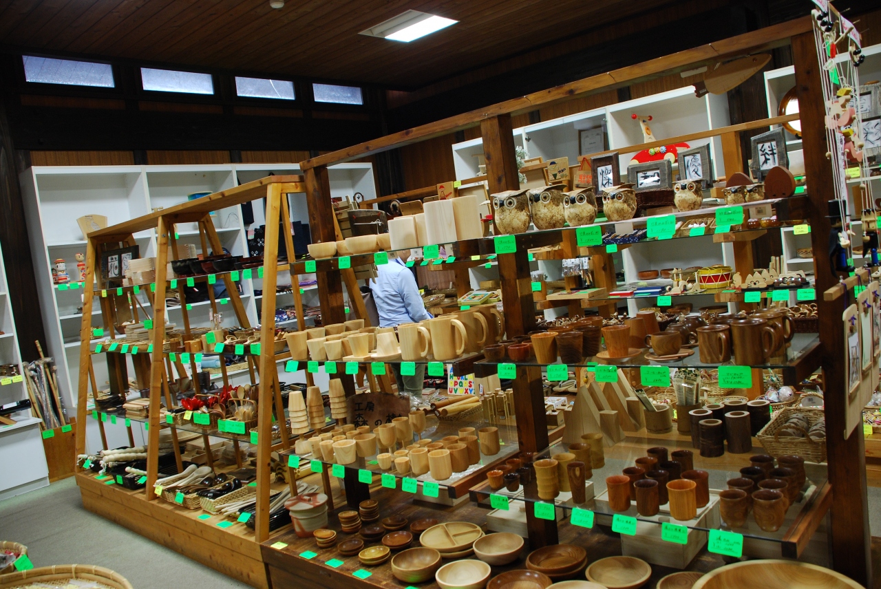町並み保存地区から鳴戸橋を渡った所に木造建築の「木の駅」があります。「道の駅」はよくありますが「木の駅」って初めてみました。さすが木材の町ですね。見学は自由で建物の中には勝山の木材について説明があったり、販売コーナーでは木製のコップやお皿などの販売もしていました。1階が主に展示・販売になっていて、2階には研修室があり森や木材についての研修などもしているみたいです。