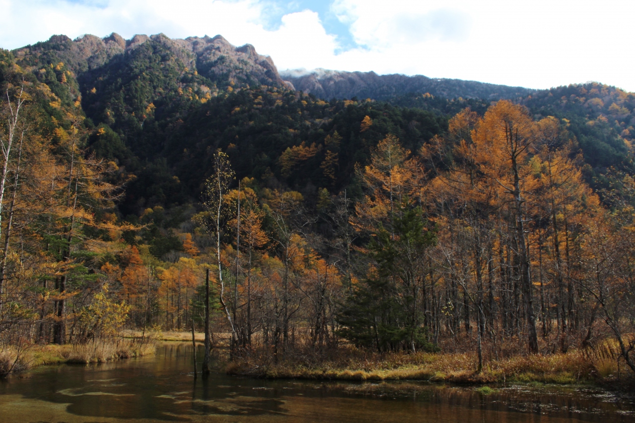 田代池は、大正池から河童橋に向かう途中にあります。田代湿原の東側の行き止まりが田代池です。いつ来てもとても澄んだ池です。正面に霞沢岳を望む静かなところです。10月下旬に行きましたが、紅葉は終わりに近く落葉していました。
