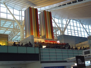 国際線ターミナル、入国審査入り口横のエスカレーターを上階に登った「江戸小路」内にあります。最前列にある店なので、眼下にチェックインカウンターのフロアを見渡せ、眺望は独特です。江戸小路は和風コンセプトのフロアですが、ここは普通のカフェの雰囲気の店です。