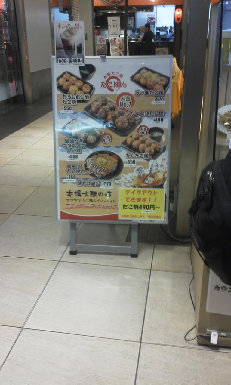 羽田空港地下、京急やモノレール利用階にあるフードコート”東京シェフズキッチン”のなかのたこやき屋さんです。シンプルなたこやきはワンコイン程度なので、小腹がすいたときに利用すればいいと思います。ラー油など変わった味もあり。