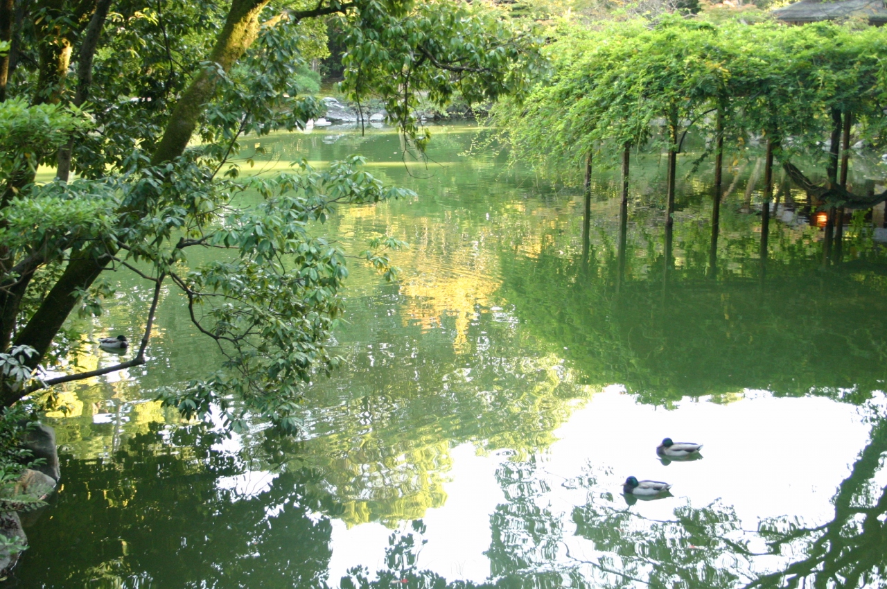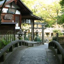 神社へはアーチ状になった石橋を渡って行きます。神社の周り九條池に囲まれていて、高倉橋と拾翠亭が見え、とても綺麗です。隠れた絶景スポットだと思います。