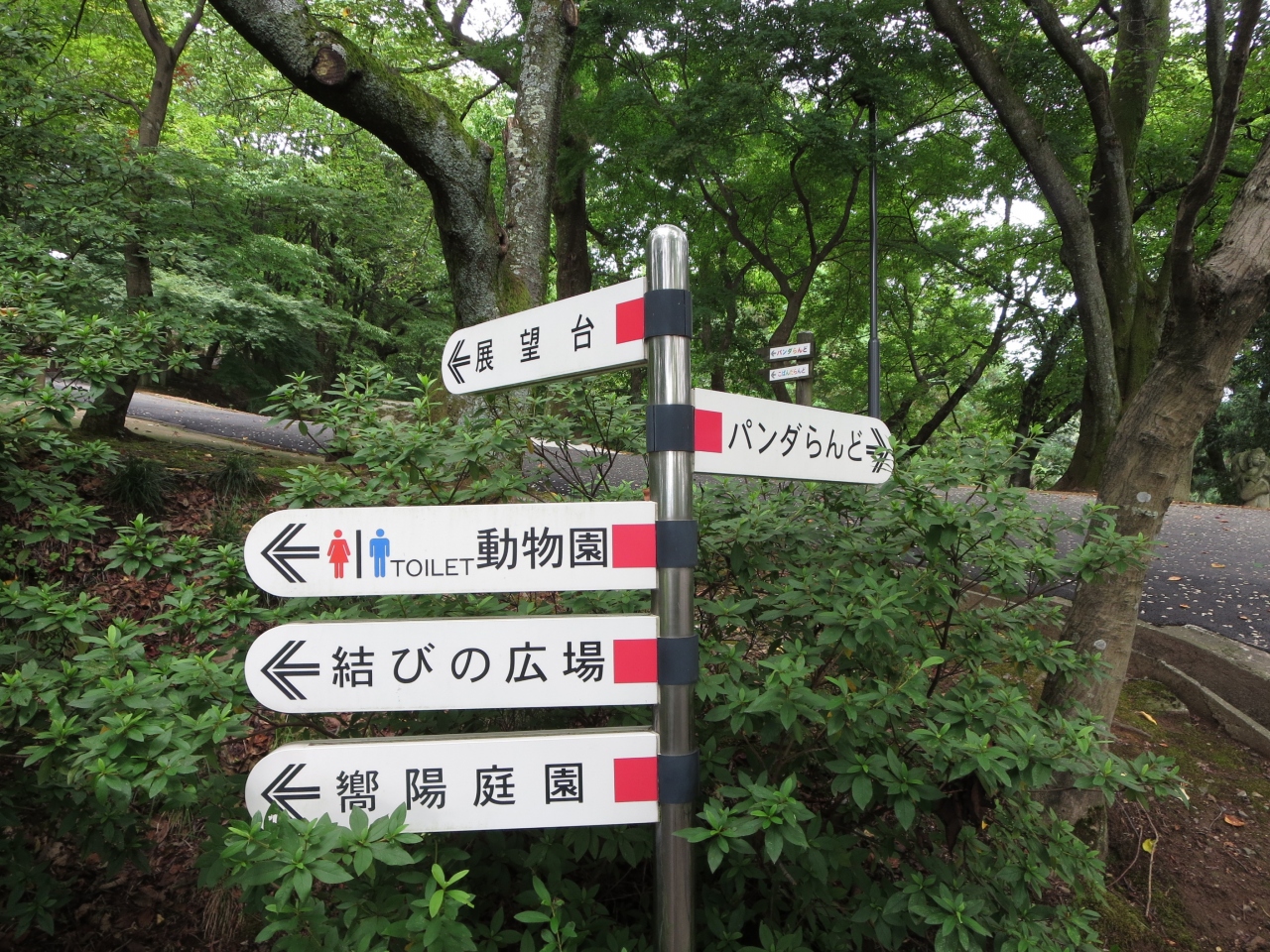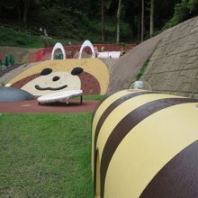 展望台へ行く道と、枝分かれして下る道もう1本あり、そちらは「ぱんだらんど」と名づけられた子供アスレチック公園になっています。レッサーちゃんの尻尾の形の遊具や、顔が描かれた斜面、お人形が何体もあり、こちらでもレッサーちゃんを満喫できます。
