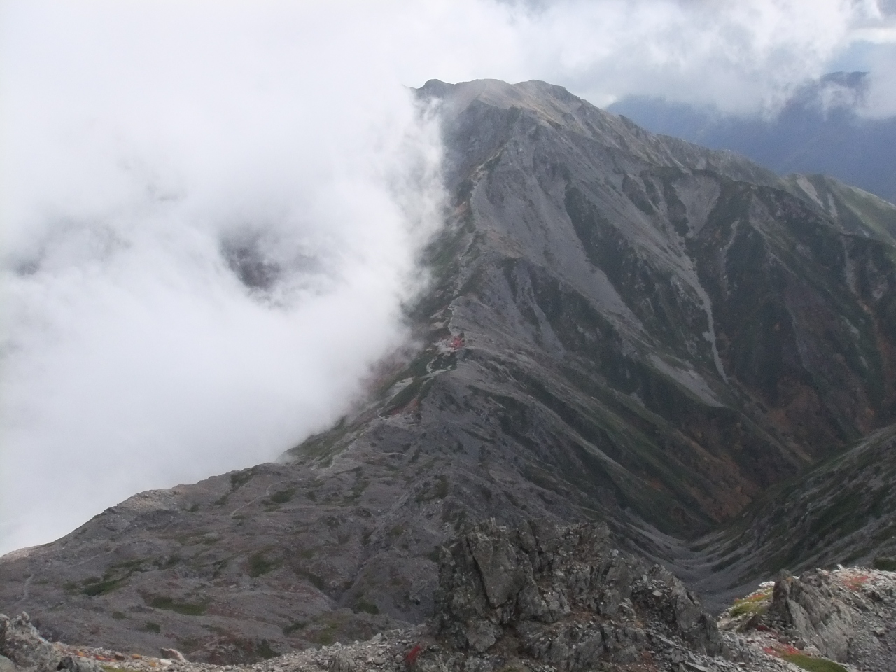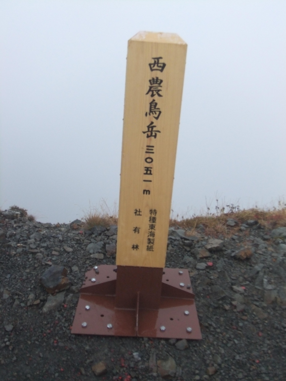 農鳥小屋に泊まり、早朝から登りました。石のゴロゴロした急斜面を1時間ほど登ると、ようやくつきます。あいにく雨と霧がひどく周りの風景は見れなかったのですが、白峰三山に名前を入れたいぐらいの急で登り甲斐のある山です