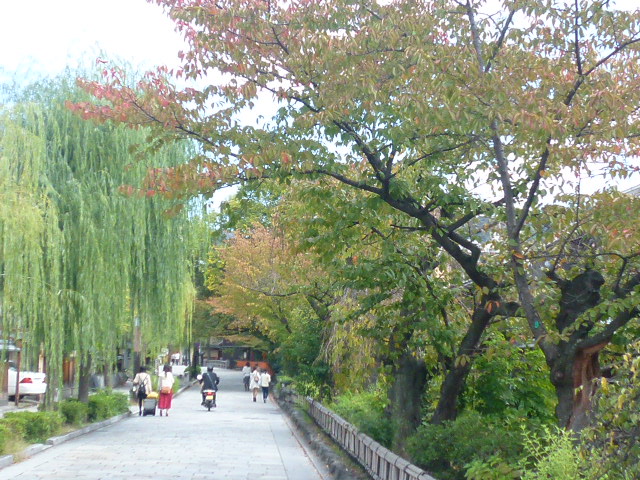 久しぶりに祇園へ来ました。「菊花賞」の馬券を買い、ここ風情ある「祇園」を散歩です。韓国人がガイドブックを持って「うろちょろ」していますね。紅葉には、まだ早いようですが、京都らしさを感じさせられるところです。柳、石畳もいいですね。夜はネオン「ギラギラ」でしょうね。お店に入ってみたいです。京都にお越しの際は欠かせませんよ。