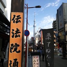 晴れた日にはスカイツリーを望むことができる。また、有名な店がこの通りに多くあり、浅草に行くなら仲見世通りの次は、この伝法院通りへ。例えば浅草メンチや天丼で有名な大黒屋等が並ぶ。その他洋服屋や着物屋があり、外国人が着物を羽織る姿を見ることができた。