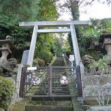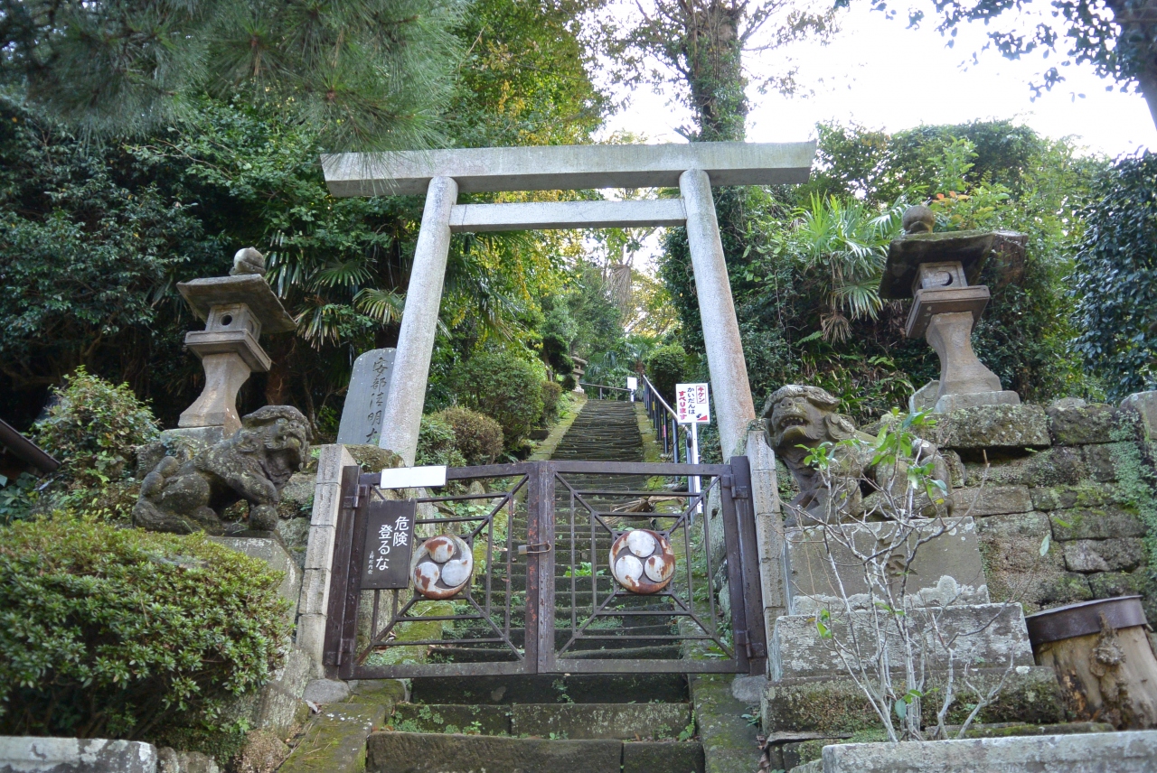 本殿に至る急な階段は緑色に苔むしていて、独特の雰囲気をかもし出しています。入り口の扉が閉まっており、中には入れません。