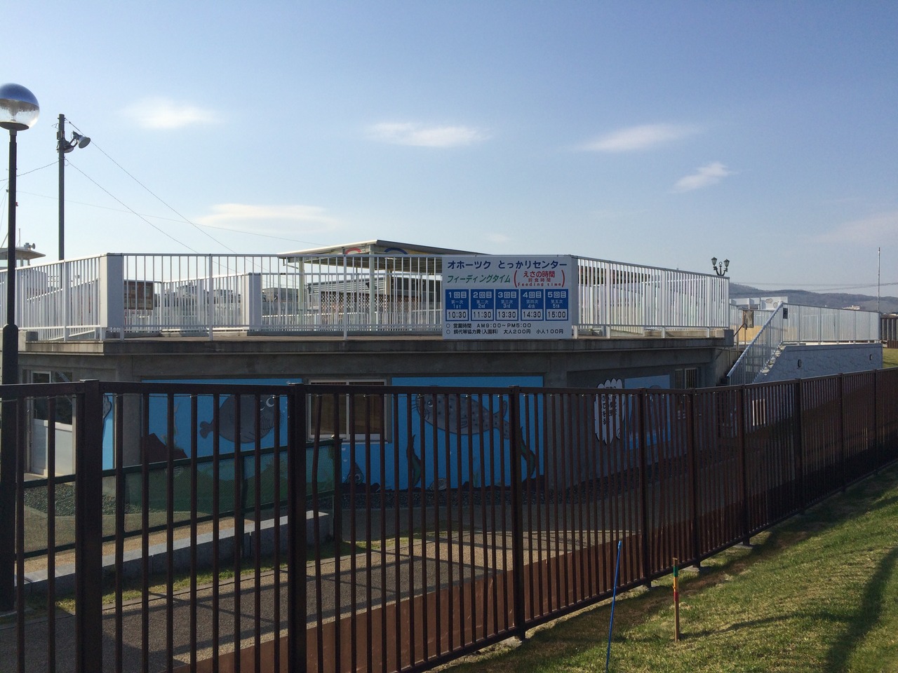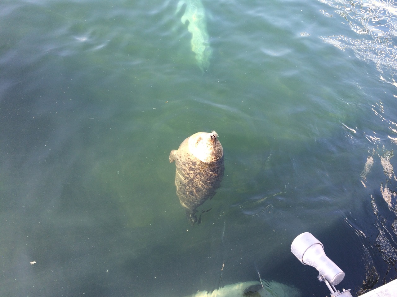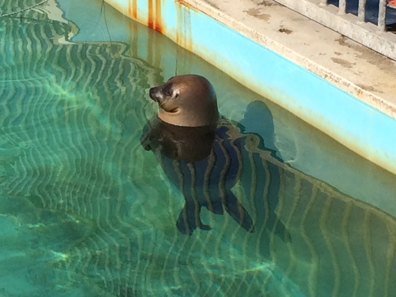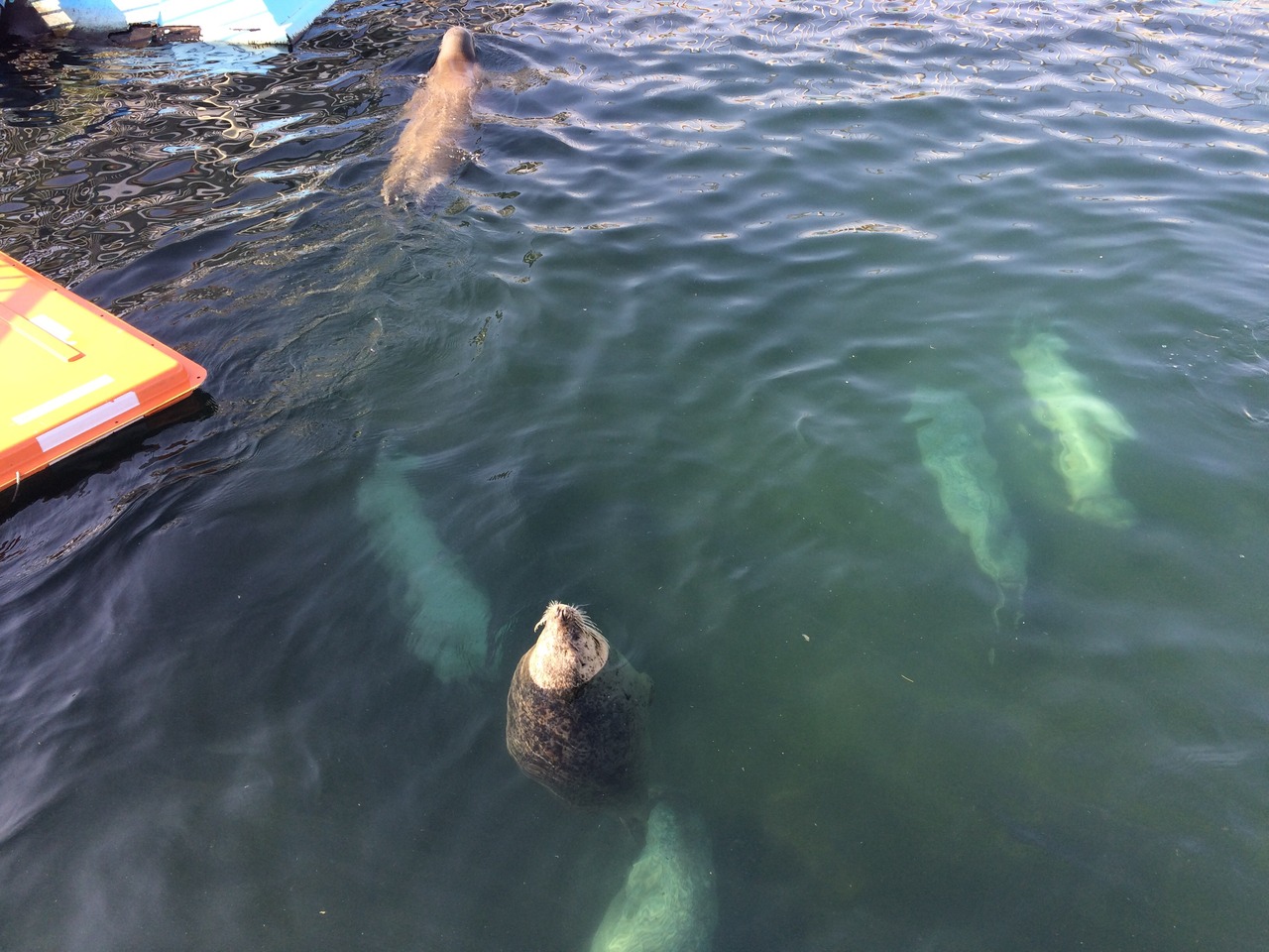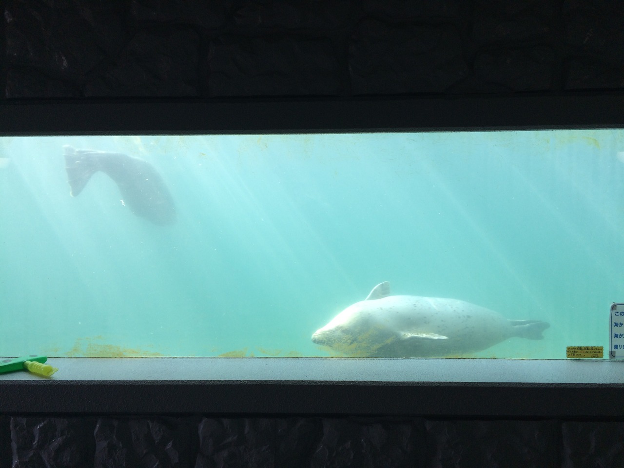 200円の入場料を入れて自動ゲートを通って中に入ると、4つの水槽があり、たくさんのゴマフアザラシがいました。上から見ていると、ずっと泳ぎ続けているのでゆっくり顔は見られませんでしたが、時々直立姿勢で温泉に入っているかのような顔を見せるアザラシがいました。水槽を中から見られるところもありましたが、少し水が濁って見え、あまりクリアには見られませんでした。