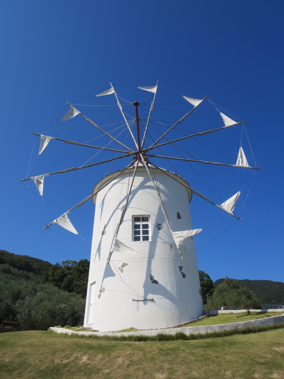 道の駅からオリーブ畑の間を5分ほど歩くとギリシャ風車。