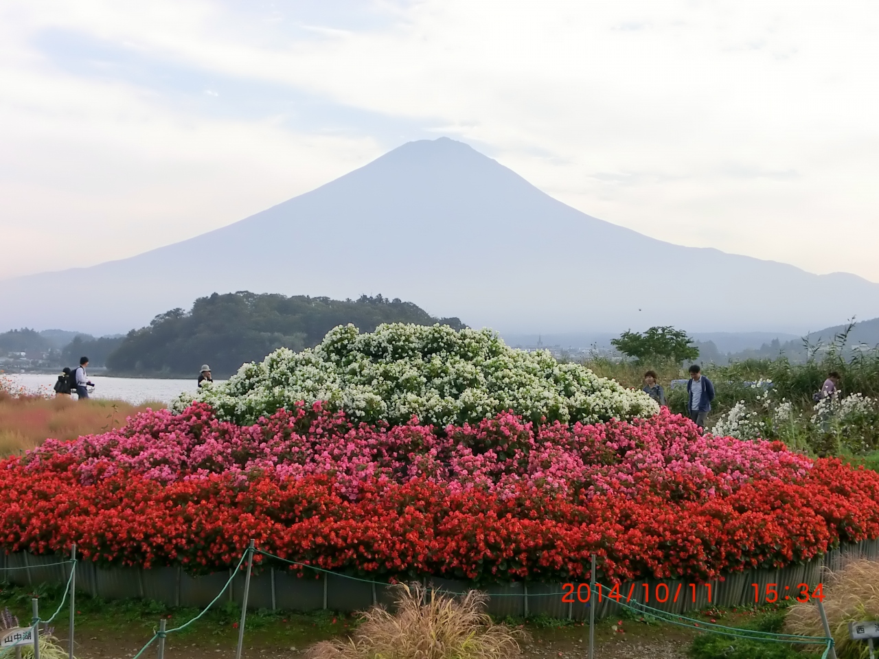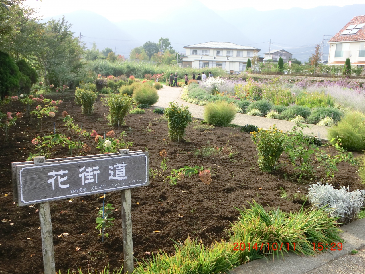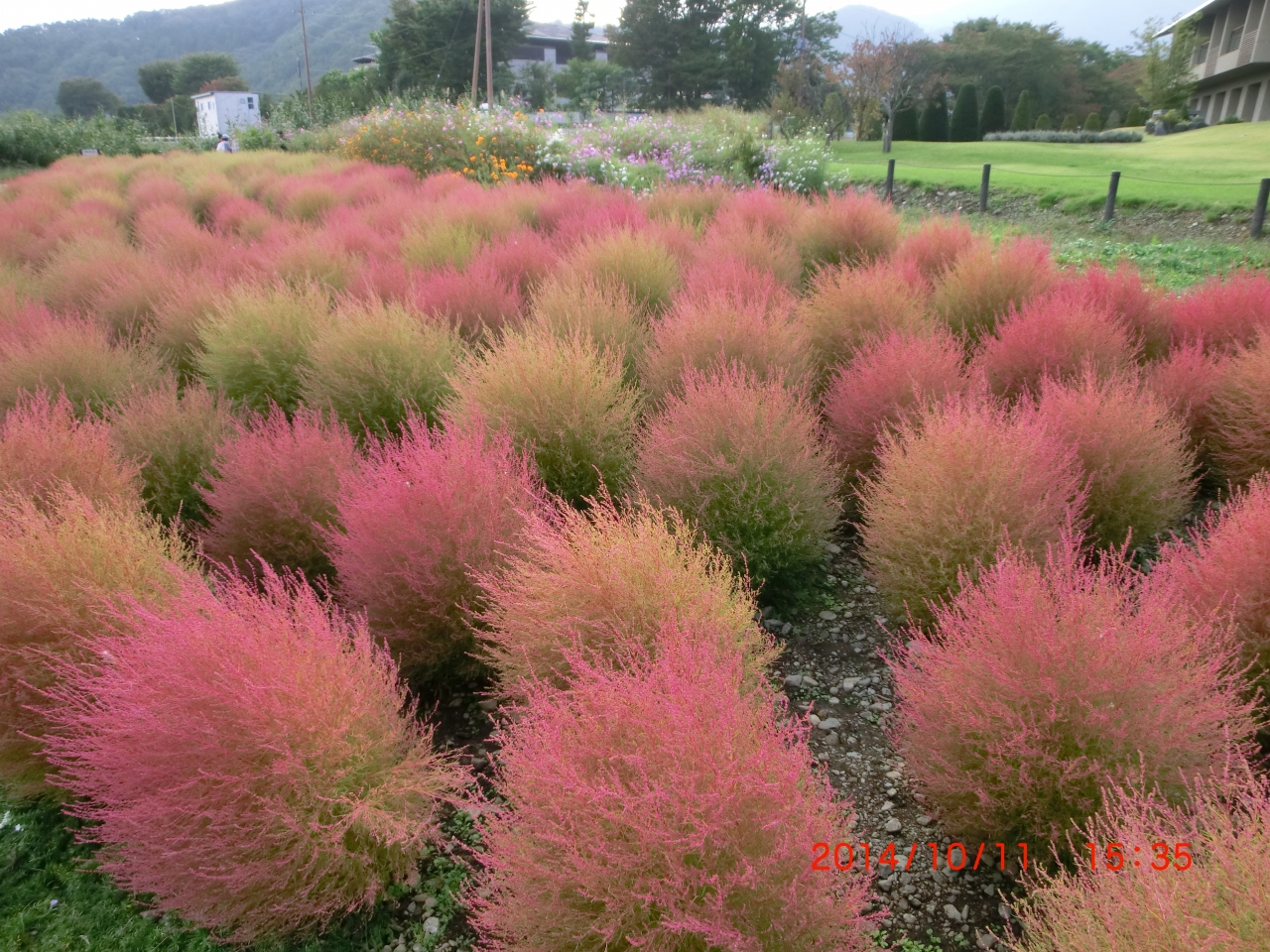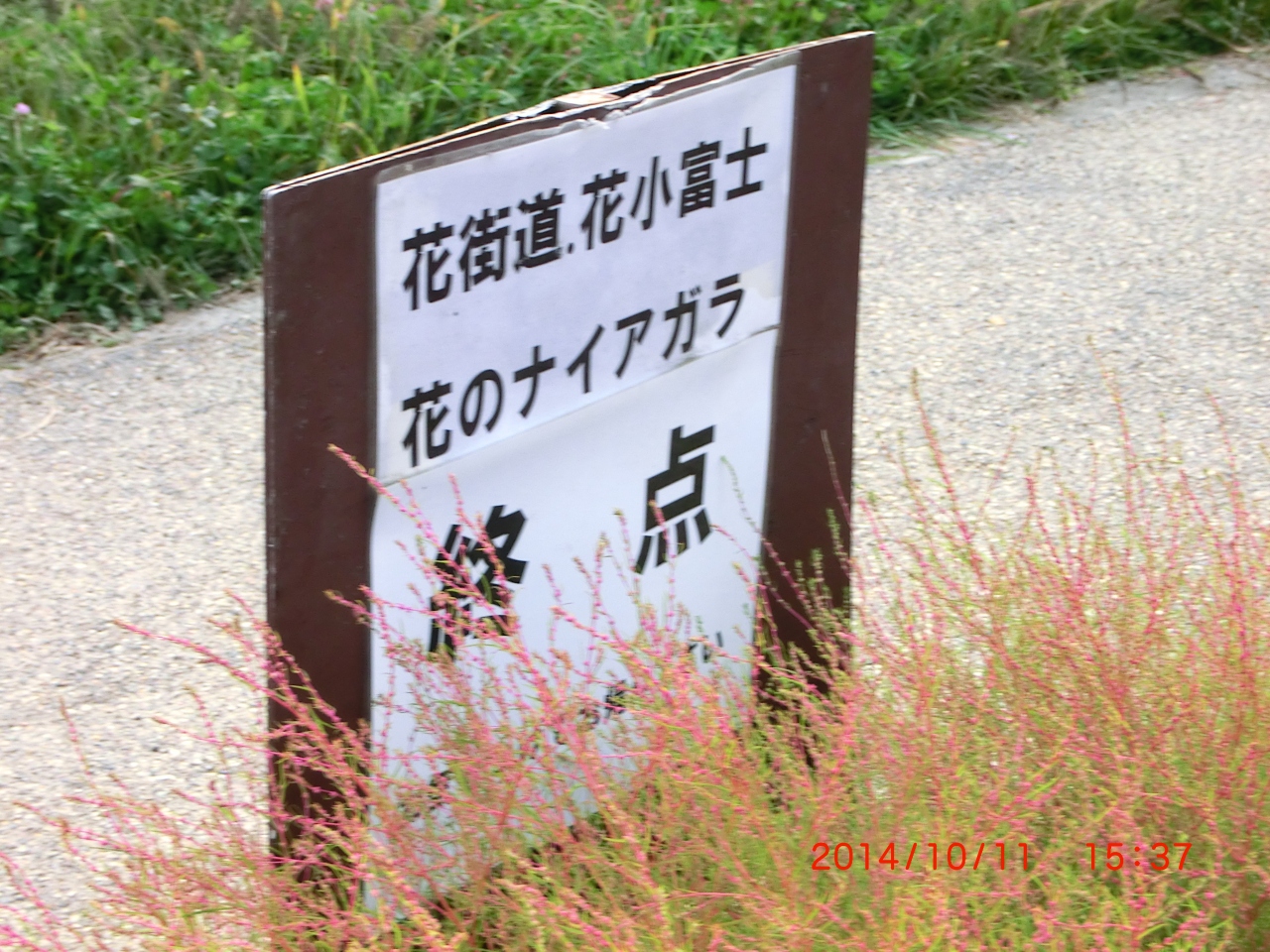 駐車場の端から全長350メートルの花街道が、花小富士があるコキアの樹海まで続いていました。私達が訪れた 10月11日 は、赤く染まり始めた頃でした。