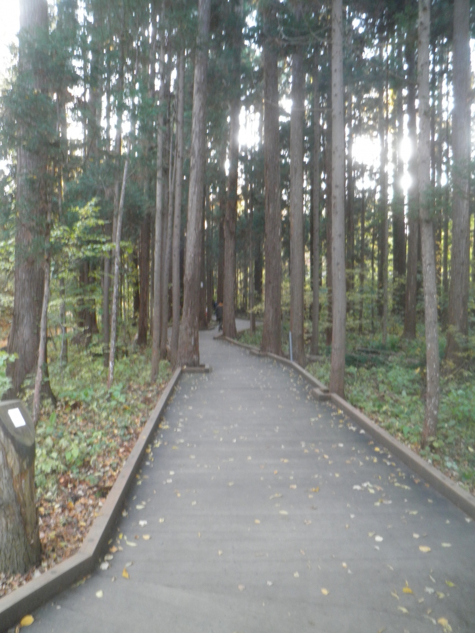 札幌の西側にある円山公園を散策しました。 動物園のほうに坂を上っていくと、円山原始林があります。 背の高い樹木が並んでいて、りっぱな木道が整備されていました。 もう十月中旬なので、木々の葉は紅葉して、落ち葉もたくさん積もっていました。