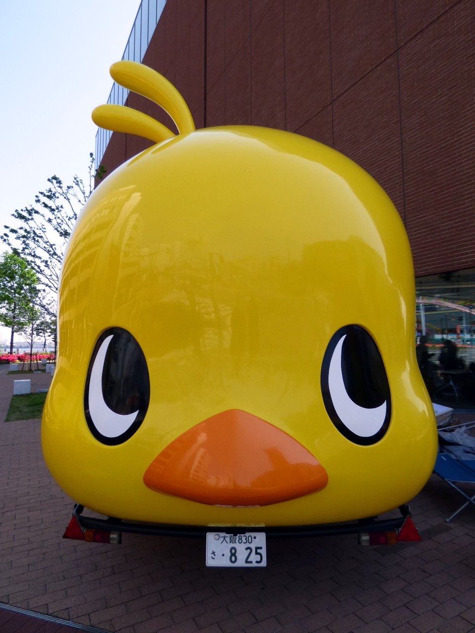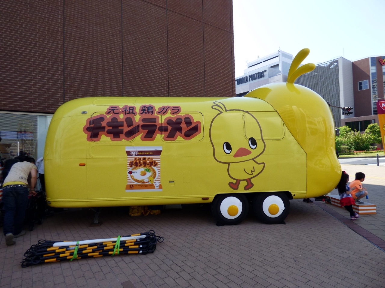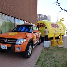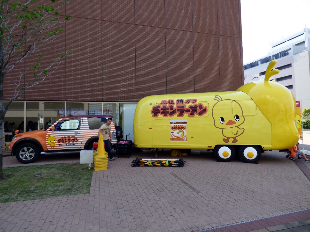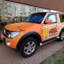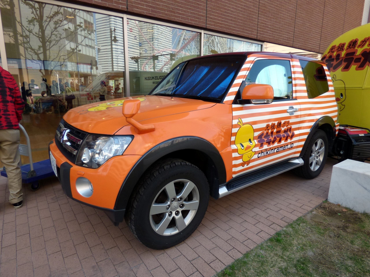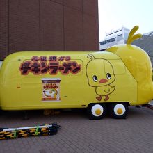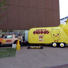 私が訪ねた時には、チキンラーメンパジェロが牽引するひよこちゃんバスが展示されていました。
