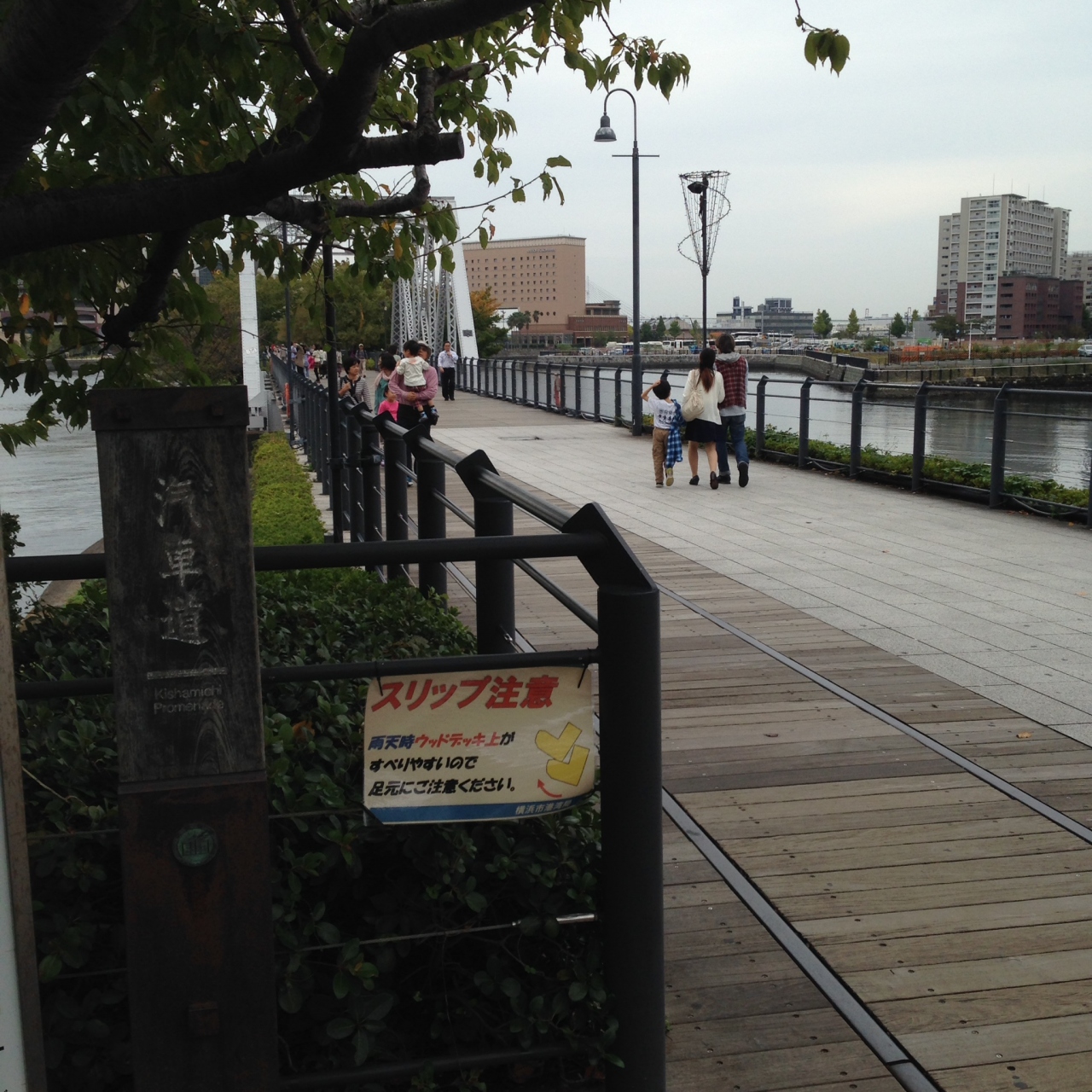 JR桜木町駅からみなとみらい方面へ出て横断歩道を渡り、歩道を歩いて行くと日本丸の右側にあります。線路をそのまま生かした遊歩道です。ワールドポーターズや赤レンガ倉庫へ行くのに、ここを通るのもいいですね。眺めが良いので写真を撮っている方を何人か見かけました。