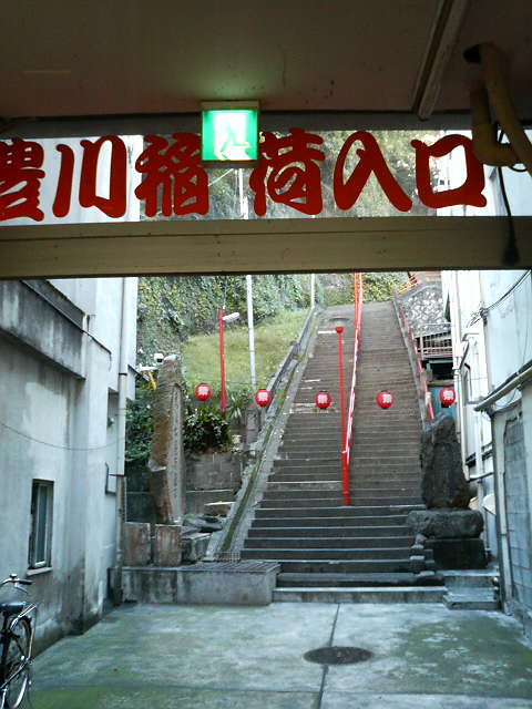三笠ビル商店街のアーケード内を進むと横に「豊川稲荷入口」と書かれた長い石段があり、それを登った先にあります。