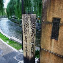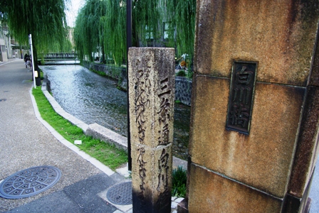 三条通の白川に架かる白川橋であるが、この東詰めにあるのが京都市登録史跡であり、京都における現存最古の道標なのである。延宝六年に設けられたものらしく、北側には「三条通白川橋」、東側には「是よりひだり ちおんゐん ぎおん きよ水みち 」と彫られている。白川橋とともに白川の柳にもよく調和した歴史ある道標であった。