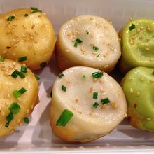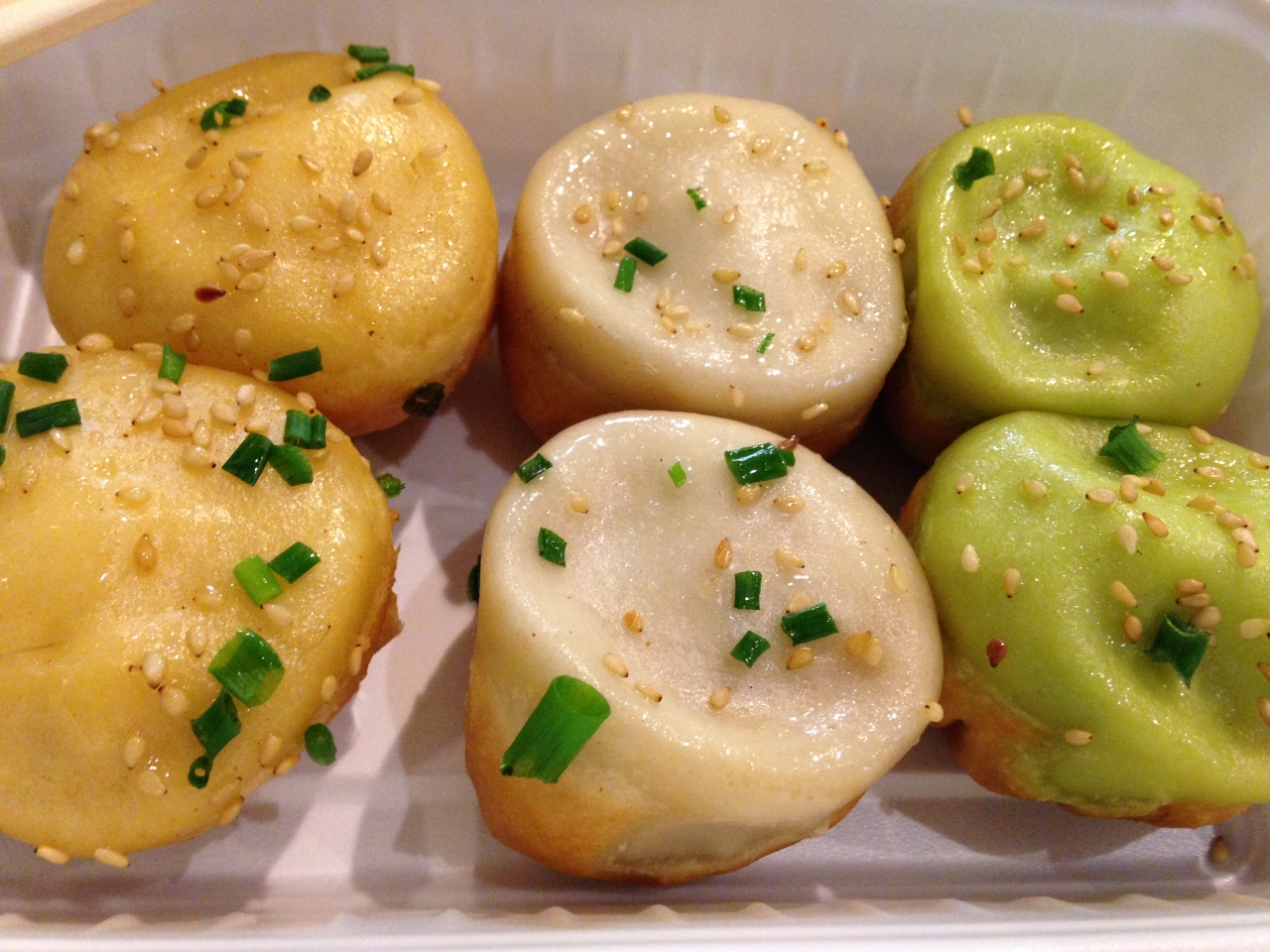 写真の右がニラが沢山入った小籠包で左がフカヒレ小籠包です。ニラは熱くなく、かろうじて暖かかったです他の2品は熱々でした。カリカリでお箸でつかみ難く、掴んでもボトッと落としてスープが飛んでしまいました。蓮華は置いてなくてお箸のみ。3種類の中ではフカヒレが美味しかったです。