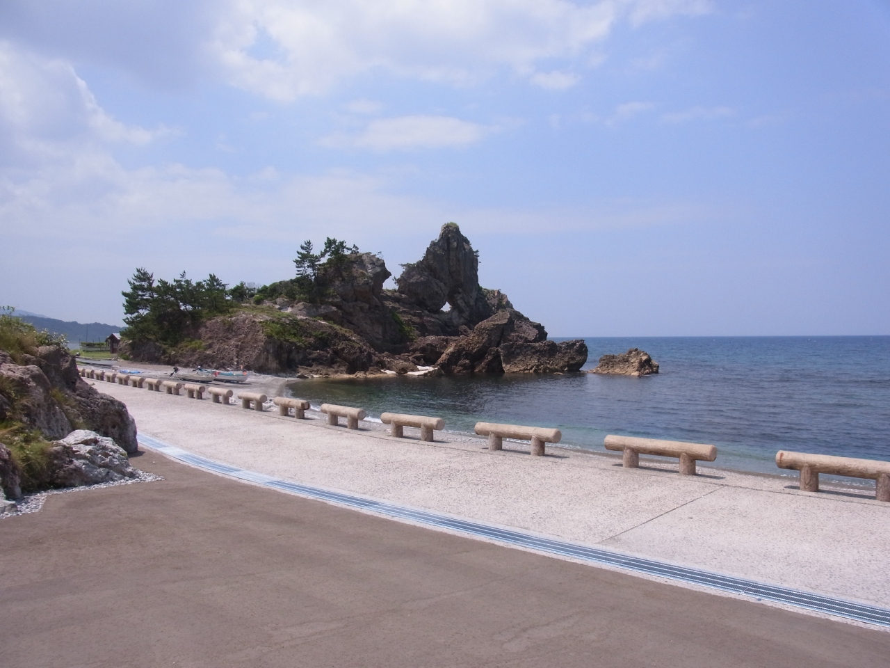 能登半島の特に北側をぐるっと回ってみたくて、輪島から千枚田、そしてこの曽々木海岸にやってきました。この日は海も穏やかで、のんびりした空気のビーチでした。千枚田には多くの人が訪れていましたが、こちらはほとんど人がいなくて、ひっそりしていました。海のそばにはたくさんの丸太風のベンチが置かれていて、海を眺めることができます。