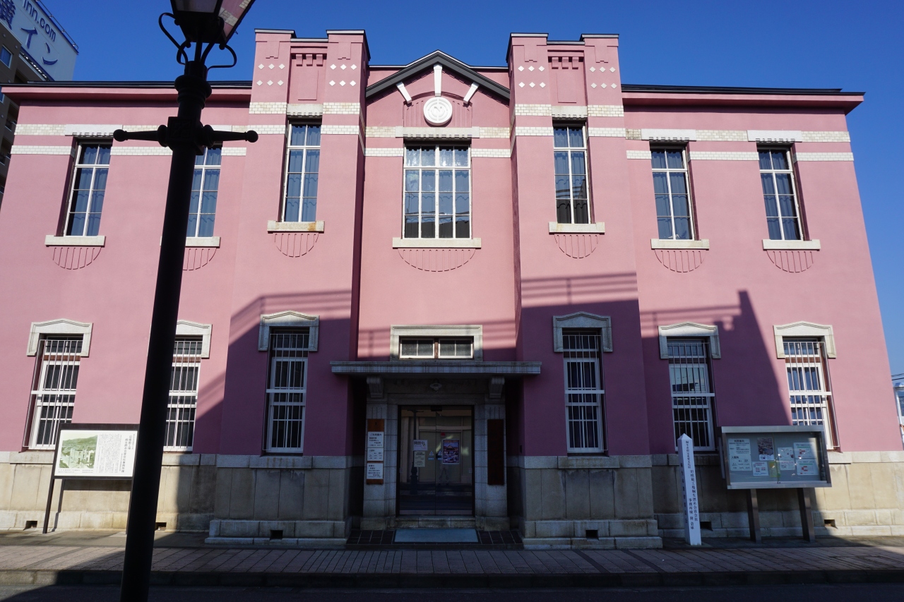 絹撚記念館は、桐生撚糸工場の事務所として、大正6年に建設されたもの。一時は、銀行としても使われていたようです。ピンクの外観は変わっていますが、がっちりした構えは確かに歴史を感じる存在感があります。
