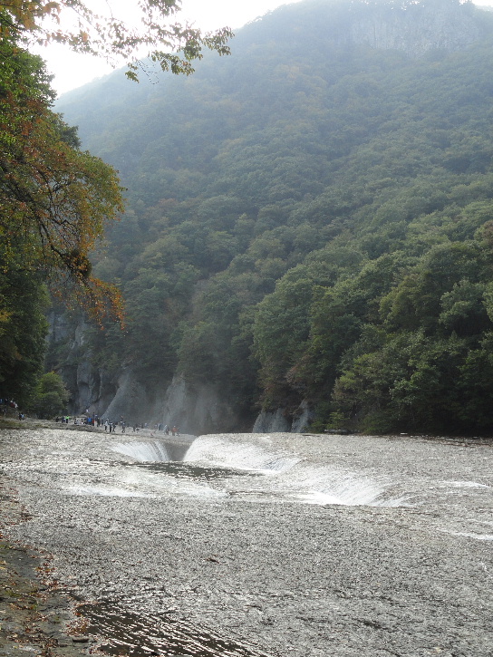 良く知られている那智の滝や華厳の滝は高い所から水が流れ落ちる壮観な眺めのなかにある滝ですが、吹き割りの滝はこれらの滝とは趣が全く違う、どちらかと言えば水平に流れ落ちる滝で、周りの景色と含めて別の壮観さがあります。