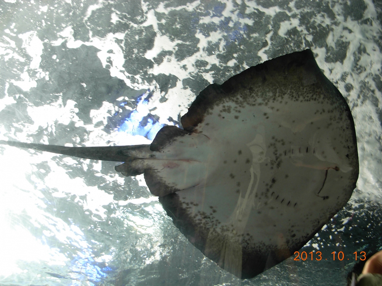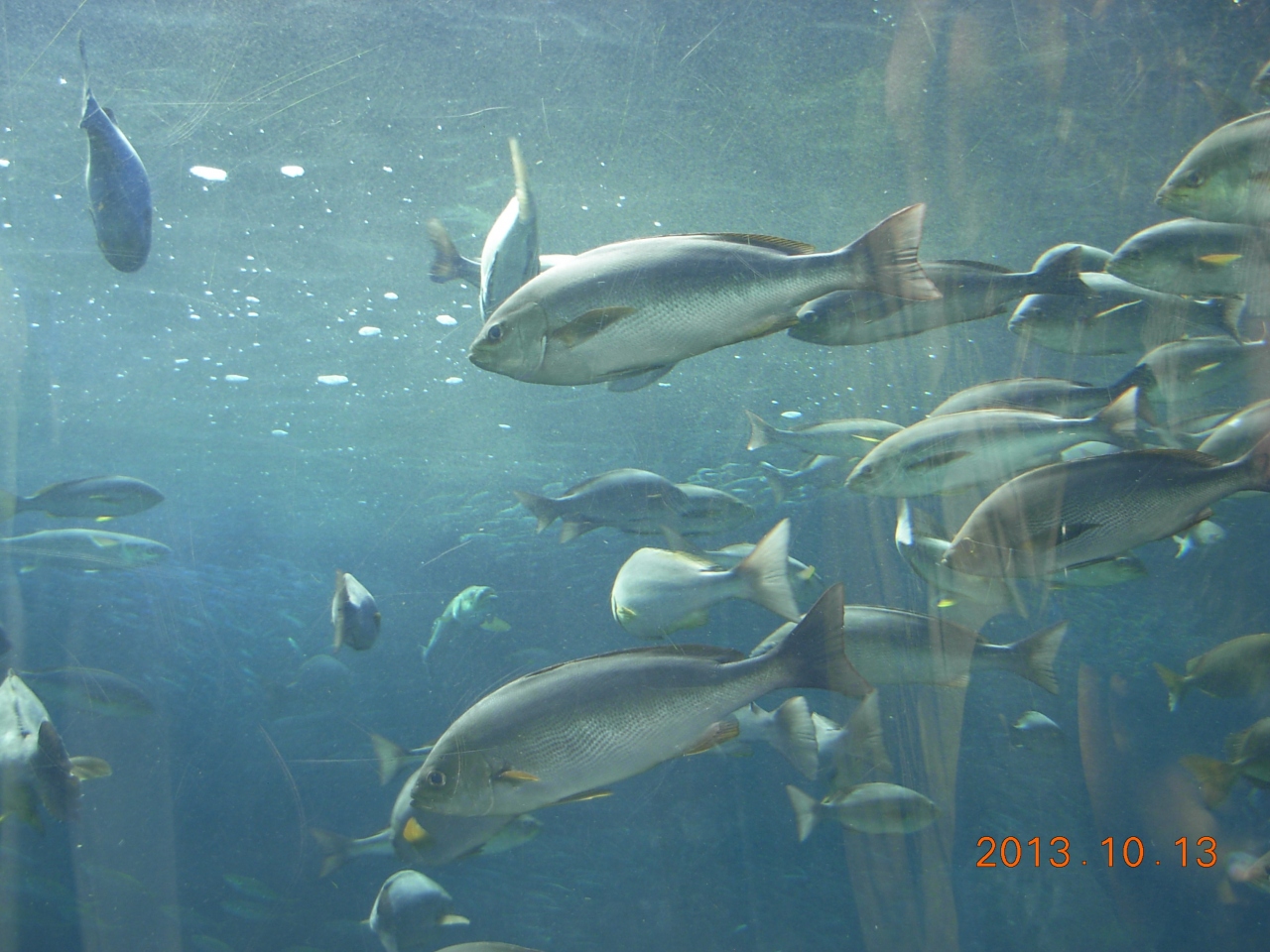 相模湾大水槽ではイワシの群れやエイなど、様々な魚が思い思いに泳いでいた。相模湾大水槽は入ってすぐのところで浅瀬を、奥では海の浅い部分を、水槽一周する間に1階分降りるので、途中では水槽の下から見る形になり、泳いでいるエイの下からの様子も見られる。最終的には相模湾の深いほうの魚もじっくり観察できる。