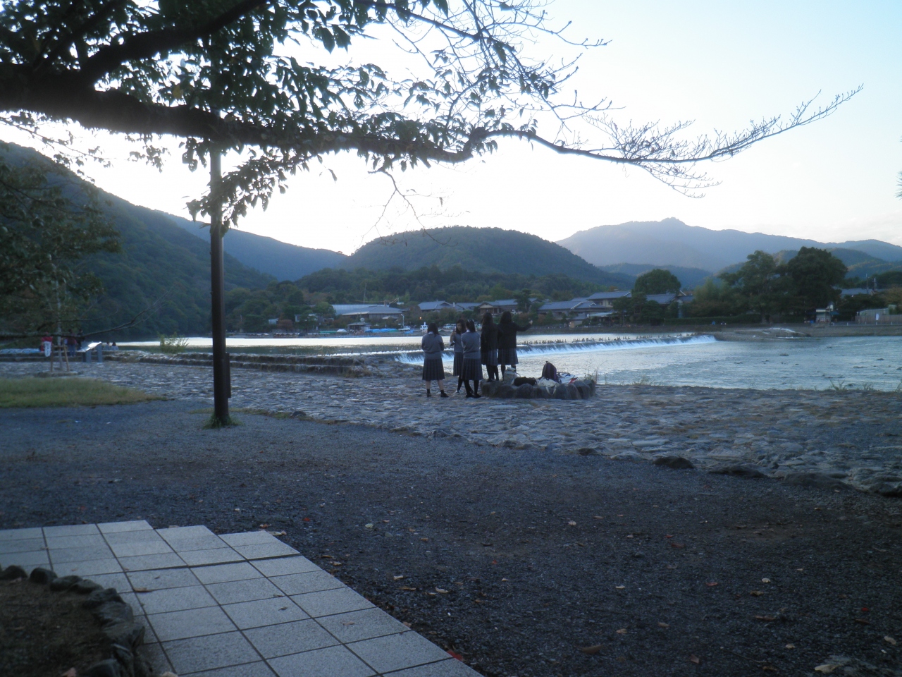 嵐山電車の嵐山駅をおりて、天龍寺に拝観したあと、渡月橋がかかる桂川の方向へ歩いていきました。 ゆったり流れる川で、橋の周りにはたくさん観光客が訪れていました。 橋の手前に堰があり、そこの公園で一休みしました。 ここは橋の前景が眺められるけど、カップルが多いです。