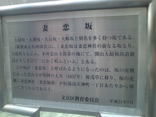こちらの坂に関しては、文字通り目の前に妻恋神社がありますので、立地的には判り易いかと思います。坂の云われに関しては、坂の途中にコンパクトに解説された案内板が設置されていますので、こちらにも是非ご注目下さい。