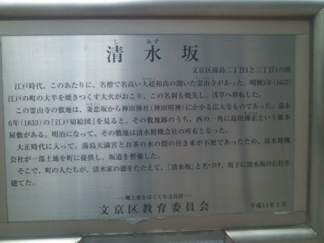 歴史ある江戸の風情を今に残す東京に数多くある坂の中では、この坂はちょっと特殊な歴史があり、簡単に行ってしまえば、それまで不便であった湯島天満宮とお茶の水とを繋ぐ便利な道を建設した、清水精機会社に由来しています。つまりその名称は大正時代に命名されていますので、江戸の歴史には含まれない、ちょっと異質な坂と言えるでしょう。