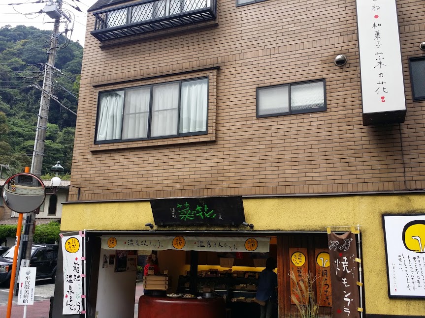 「はこね和菓子 菜の花」は、1号線からちょっと外れに、早川をわたった吉池旅館の脇にあります。大きな看板があるのでわかりやすいですし、駅前の店よりはすいています。