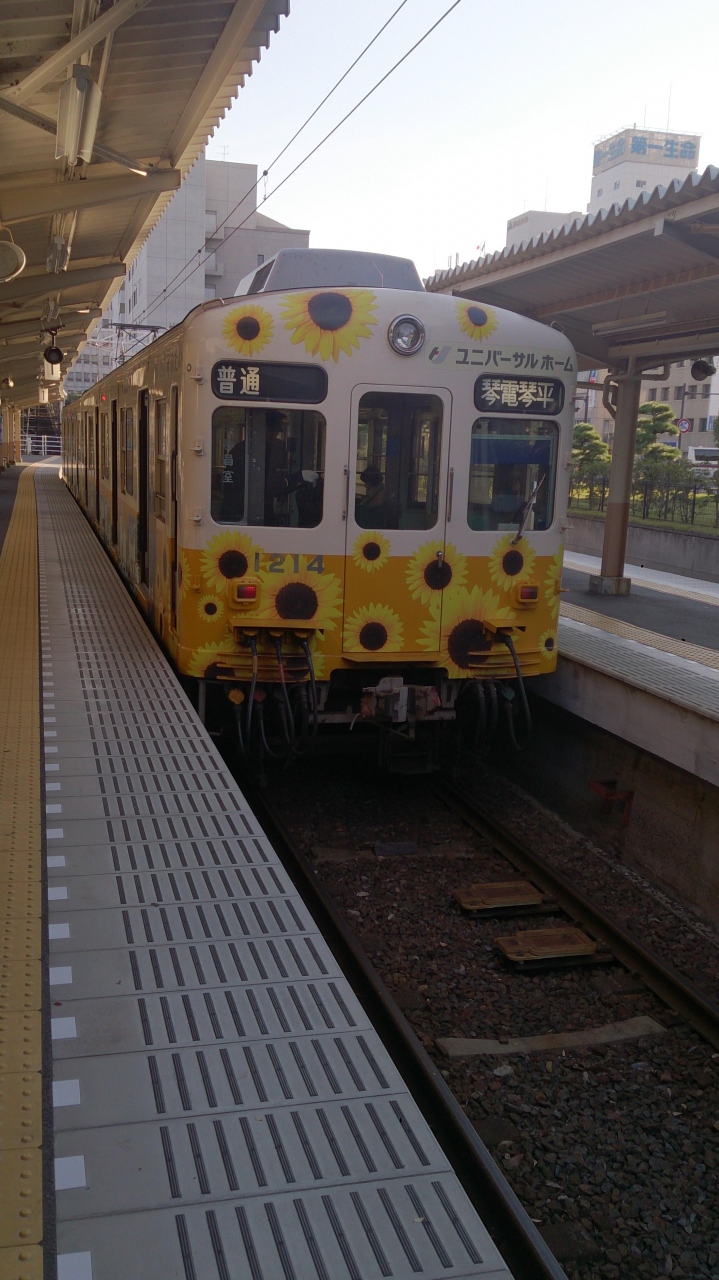 琴電は大手私鉄の車両の第二の活躍の場で、首都圏の人間からとすると、懐かしい車両が現役で見られます。鉄道マニアではないですが、思わずなめまわすように見いってしまいます。この電車からの車窓は讃岐平野の田園風景がひろがり、何となくホッとします。