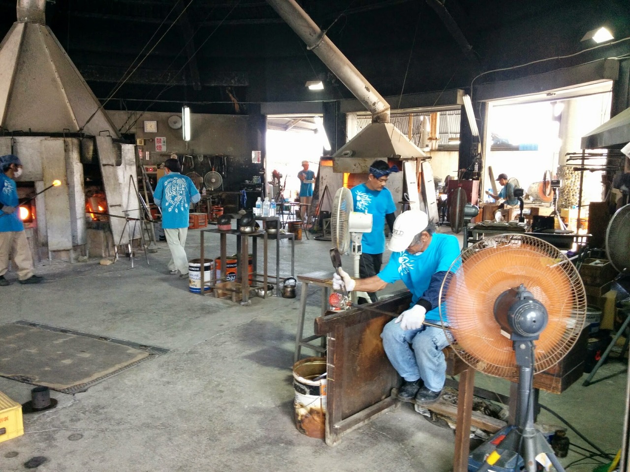 工房では、職人さん逹の琉球ガラス製作を直接、目の前で見れるようになっており、職人さん逹のすご技に感動します。