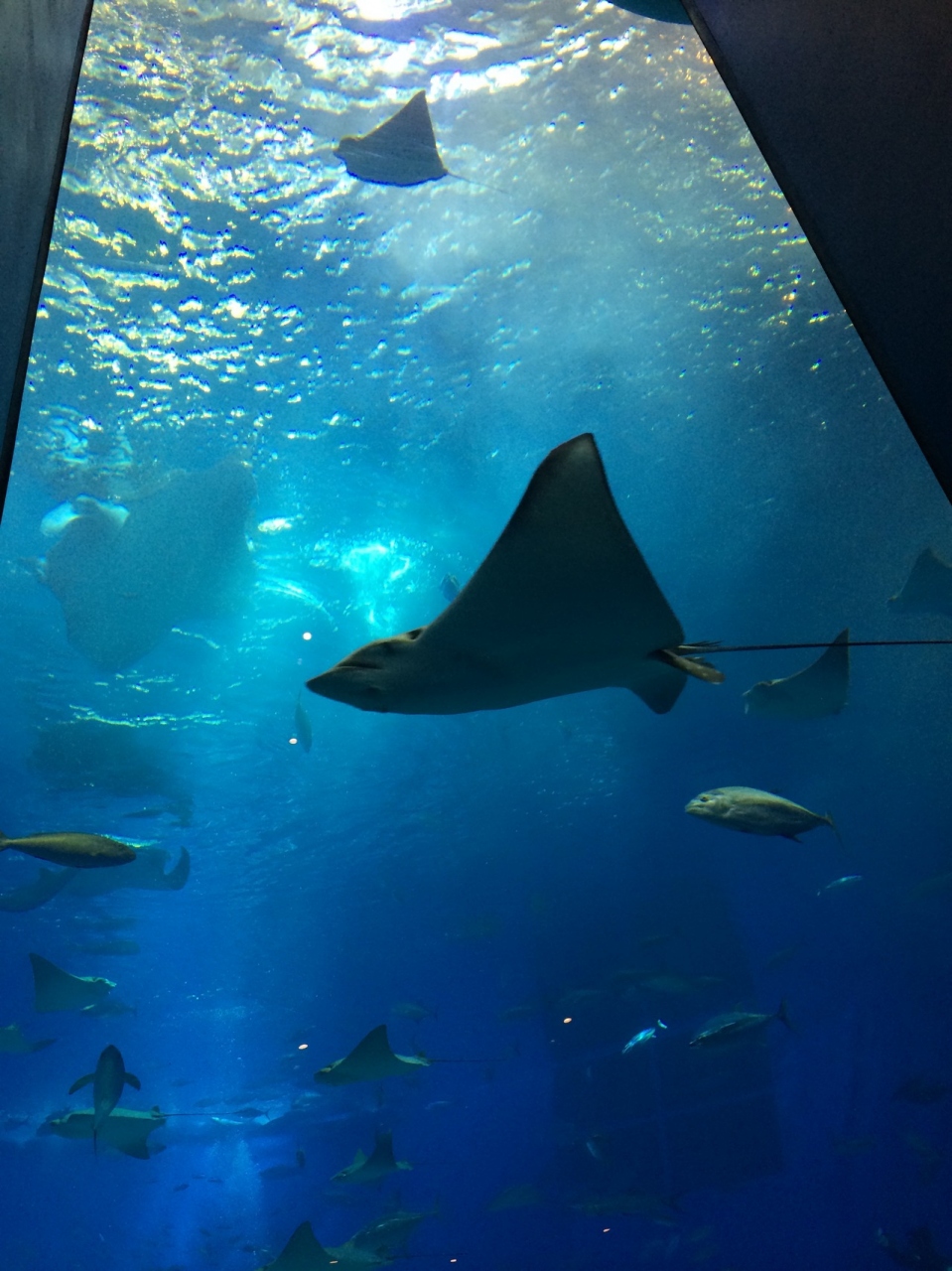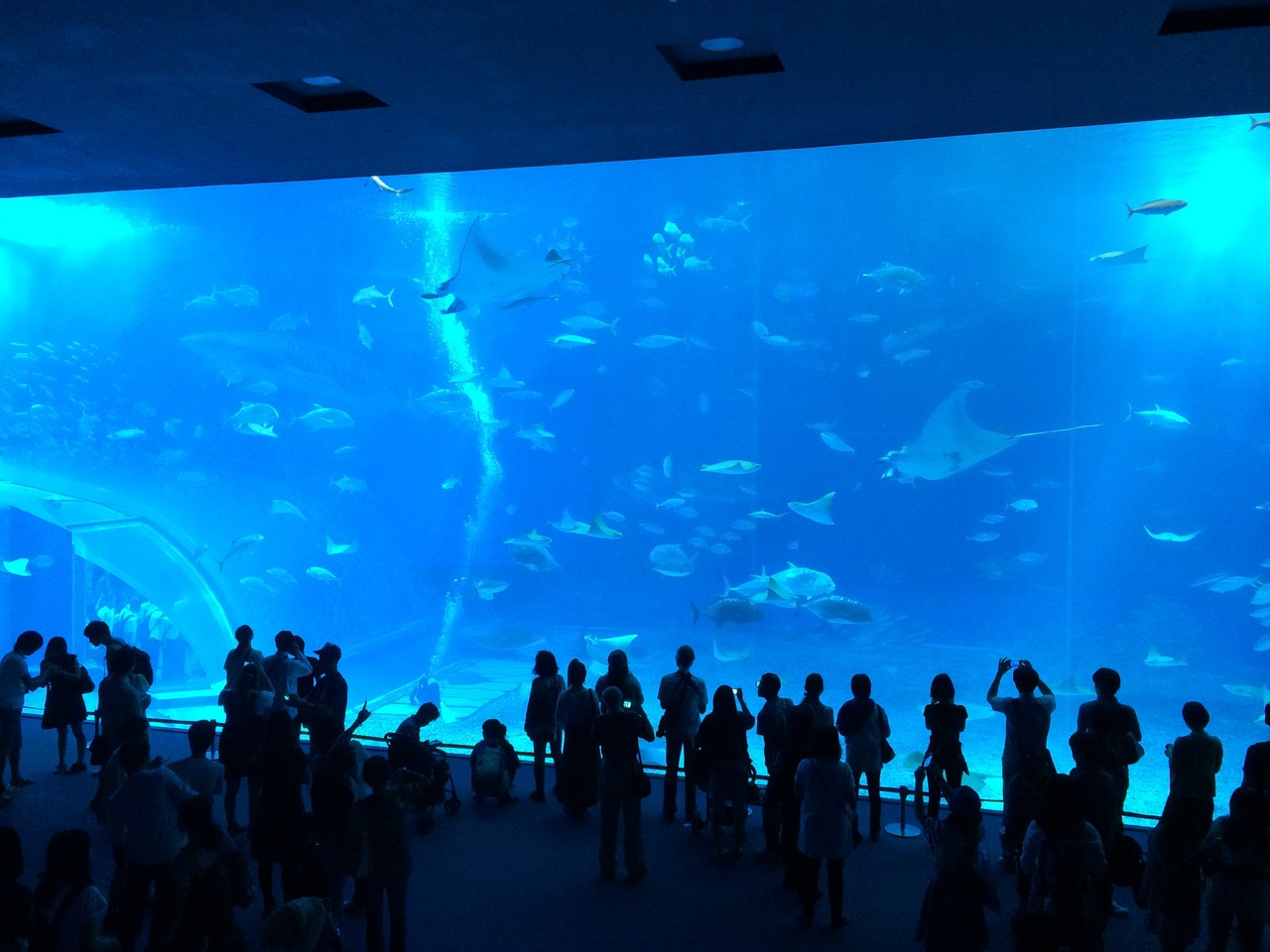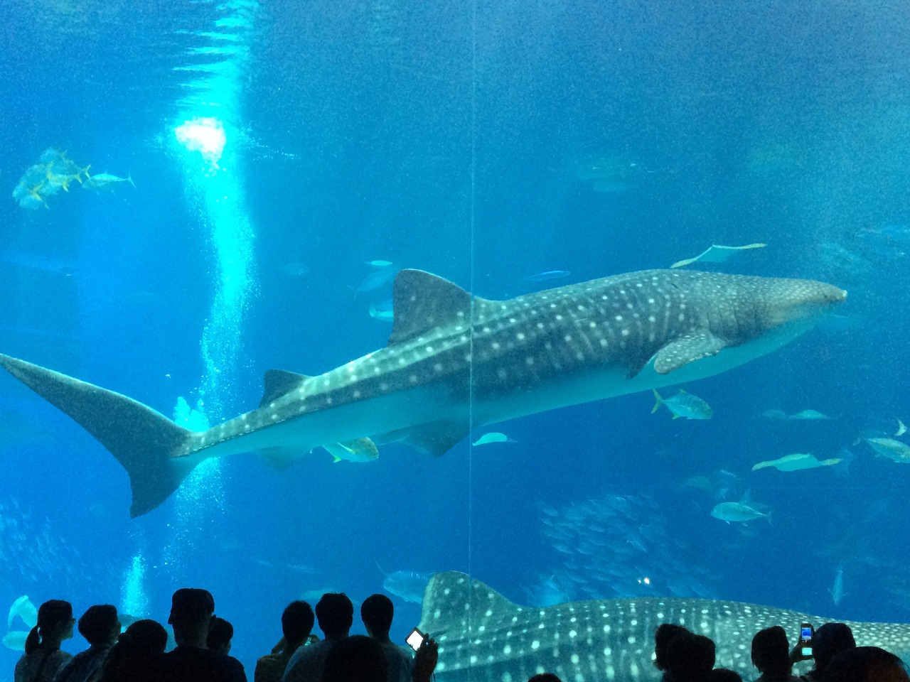 二回目の美ら海水族館に行きました。修学旅行シーズンなのか、高校生がとても多かったです。10月の平日とはおもえない混み様でした。見どころはやはり巨大水槽です。写真のようなジンベエザメが3匹、他にもマンタやエイなどたくさん居て、スケールの大きさに圧巻です。水槽の横にカフェがあり、ずっと居ても飽きません。やはりこの水族館は楽しいです。