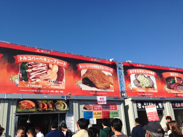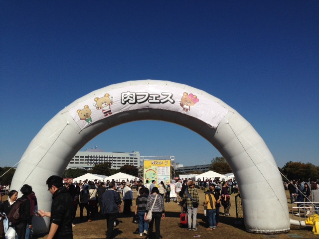 10月29日水曜日に肉フェスに行きました。平日ならばすいているだろうと思ったのですが、いっぱい人が来ていました。肉フェスには公園に入らなくても、行けます。公園内のみどりのゾーンは入園料がかかりません。立川口の駐車場に車を止めて歩いて5.6分でしょうか。肉フェスの会場はすぐにわかります。夫婦やカップルがいっぱいで、ビックリしました。観光バスで集団でくる方々も。チケットを買ってはらうほか、WAONやNANAKOなどの電子マネーも使えて便利でした。並ぶのは仕方ありませんね。平日でも30分から45分待ちは覚悟で。たった一つ残念だったのは、会場にペットを入れられないこと。ペットは連れて行かずに、肉フェスでおいしいお肉をいっぱい食べてから、入園料を払って公園でお散歩にしたほうがいいと思います。