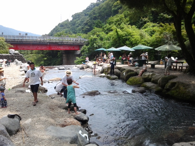 毎年、梅雨明けの暑い日に行きます。が、ここに来ると2~3度気温が低くなった気がします。緑の木陰の「おかげ」は勿論、奥に進むと清流があります。ここからの冷えた空気が気温を下げてくれていると思います。その場所では「マス釣り」と「バーベキュー」ができる隠れ場所なスポットです。