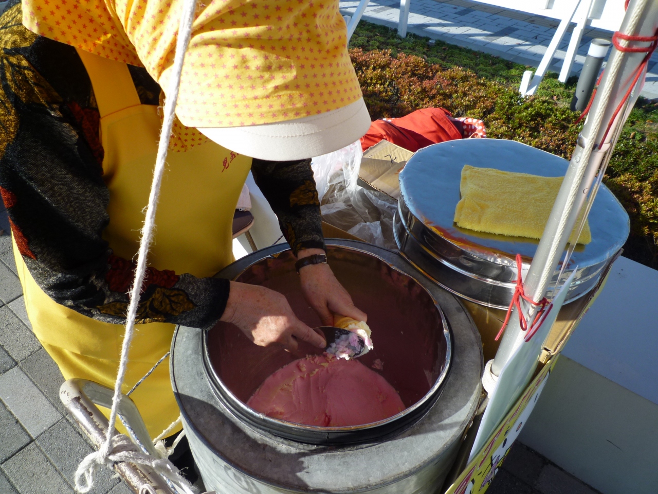 地元民なら誰でも知っている秋田名物です。主に夏の国道沿いに佇んで売ってますが、最近ではイベント会場のほか、秋田駅構内、市立図書館前、千秋公園内など観光客のいそうな所にも出没しており、ババヘラファンにはありがたいです。味は「イチゴ味とバナナ味」だそうですが、言われるまでそうは気付かなかった、言われても「えー?」という感じです(笑) それでも昔懐かしいシャーベット状のアイスでとても美味しいので、ぜひお薦めしたい名物です。