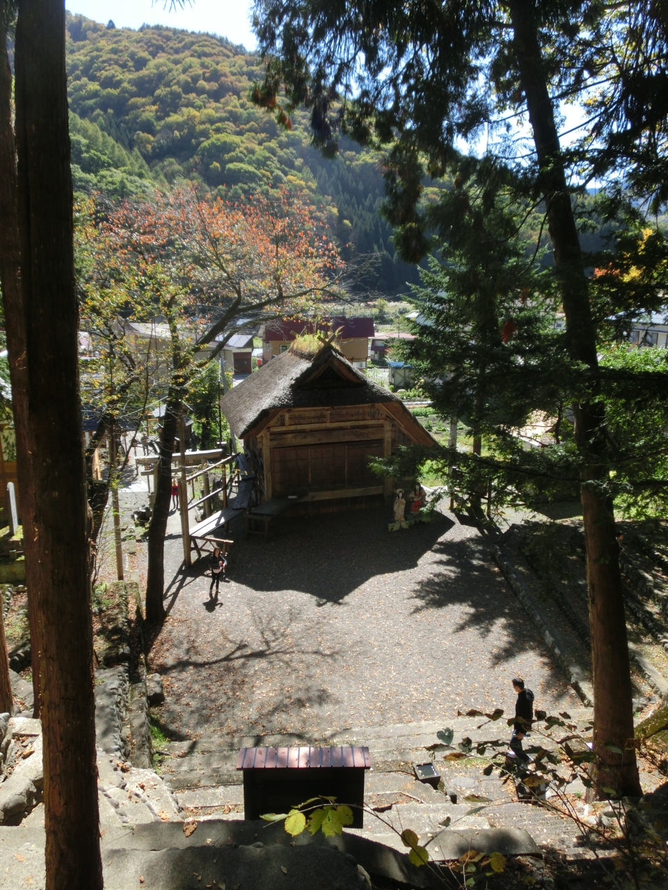 「奉納」ですから、舞台は神社に向かって建てられています。なので、神社への石段が観客席になり得るのです。その石段が広くて立派です。1200名程度の観客が入ります。