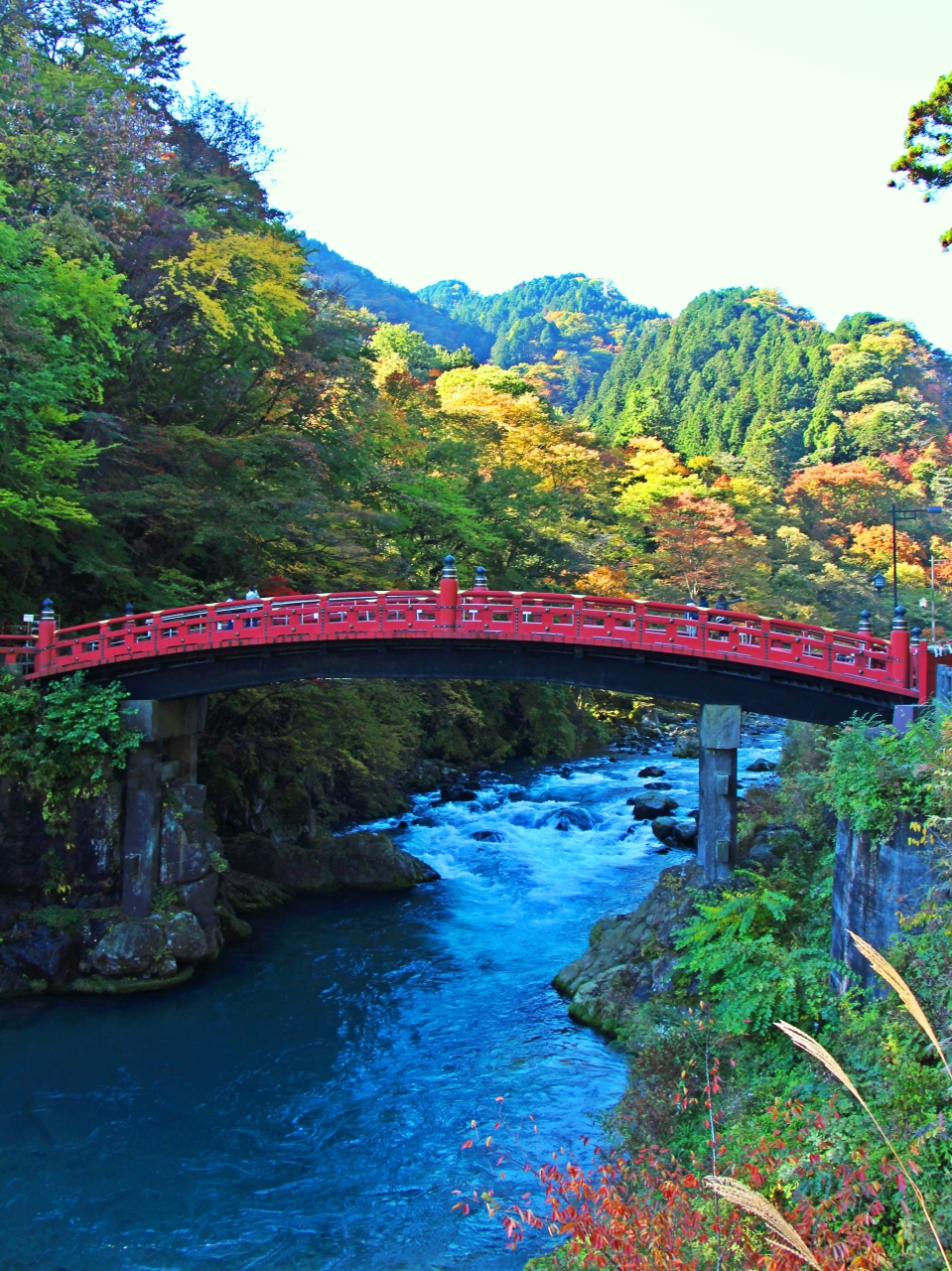 紅葉の時期、日光の大谷川に掛かる神橋は、川の蒼色、橋の朱色、そして川の両側の木々が織りなす錦の色に彩られ、まるで絵画のような風景となる。