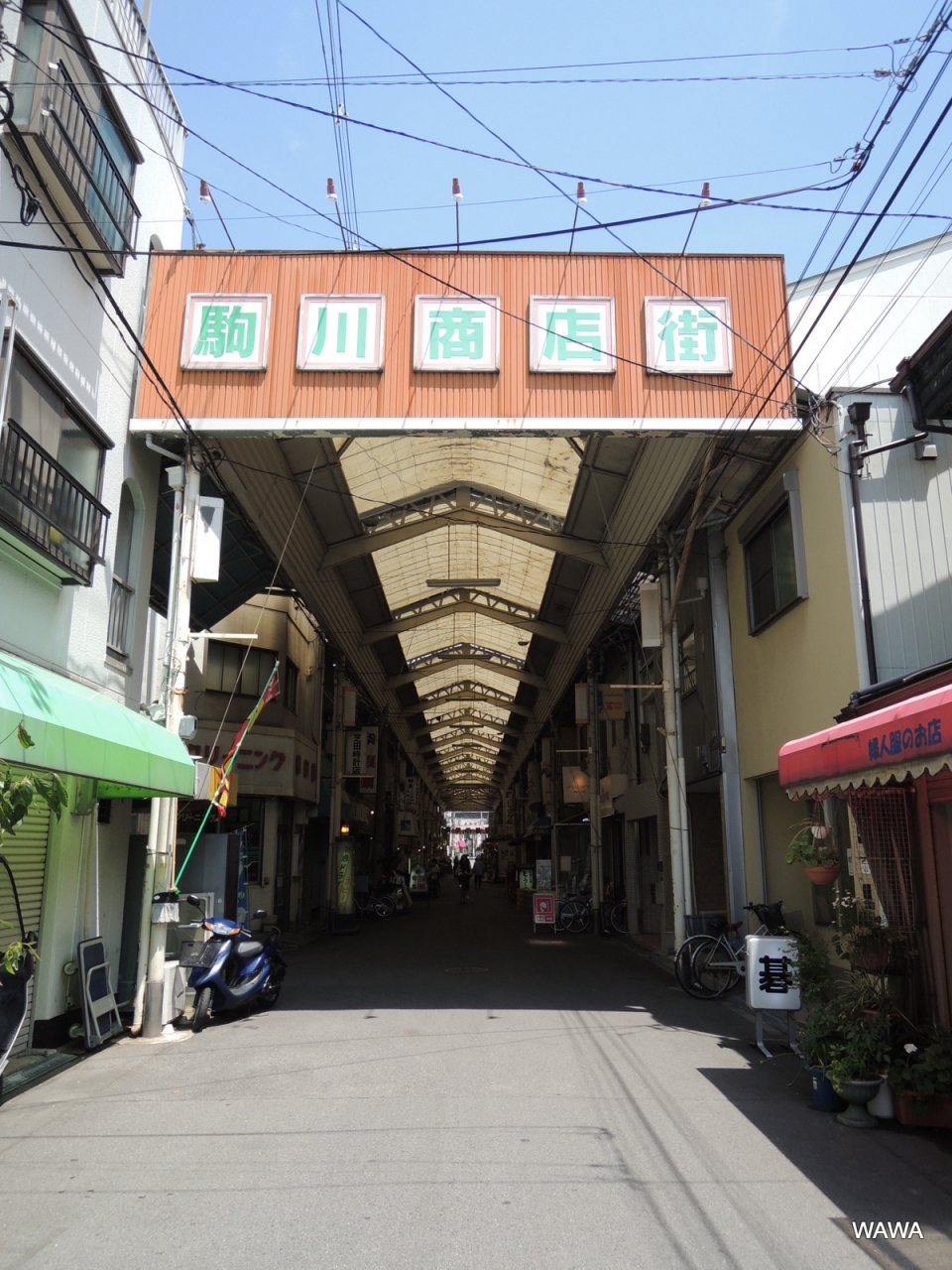 駒川商店街は大阪市東住吉区駒川にある、全長730m(東西190m,南北540m)の十字形のアーケード商店街です。昭和5年に大阪市公設中野市場(現在は廃業)が開設されたことを機に商店の集積が始まり、戦後から高度経済成長期にかけて店舗の数が増え続け、現在の駒川商店街へ発展したとのこと。