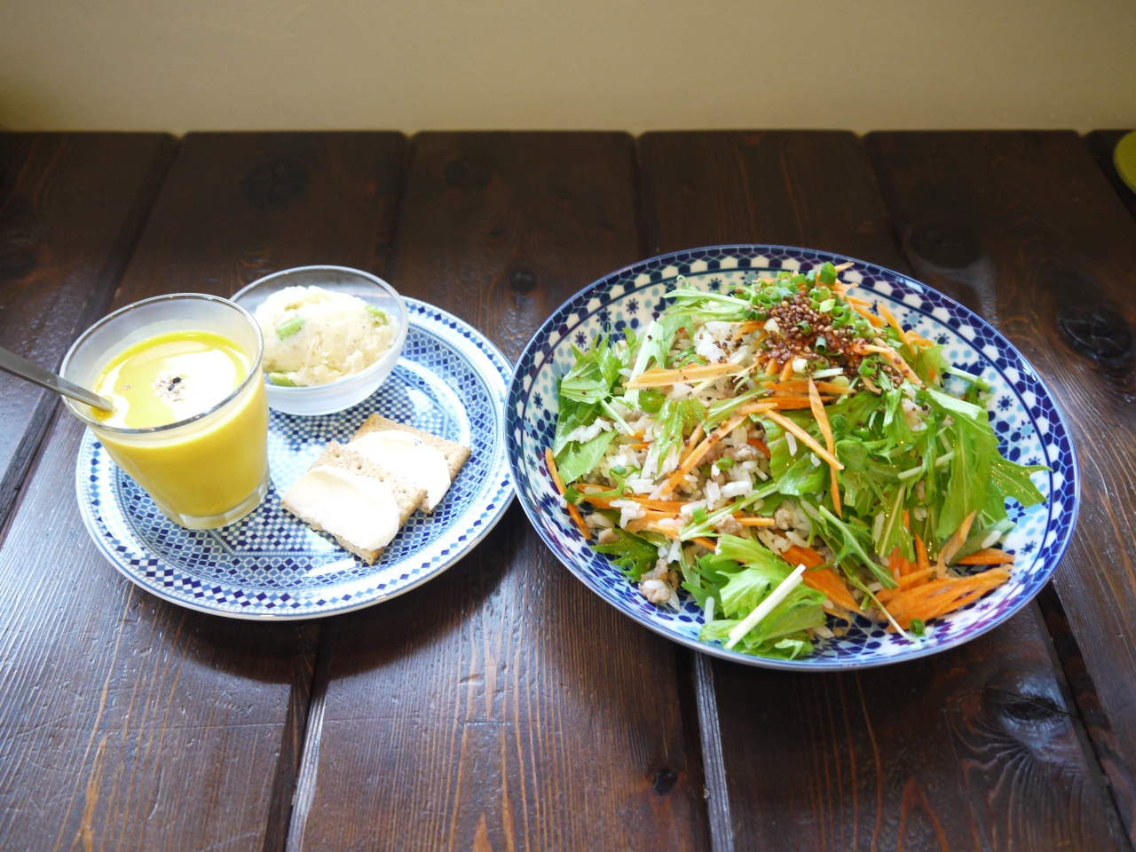 かぼちゃのスープにクラッカー、混ぜごはん、どれもおいしいという評判どおり、