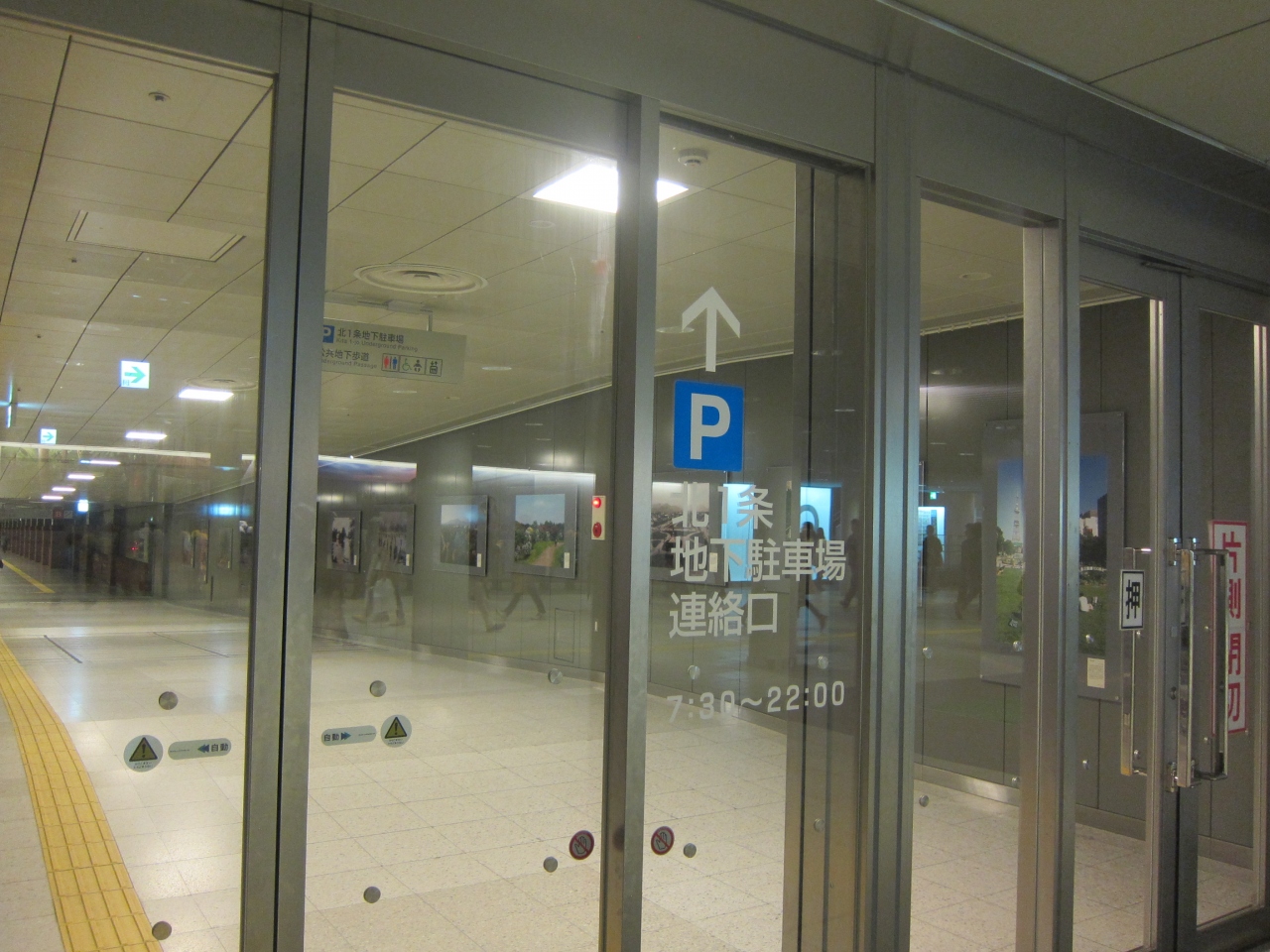 通路を更に奥まで進むと、北1条地下駐車場があります。7時30分~22時の入出庫時間の制限はありますが、合計163台停められる30分¥200円の札幌中心部の地下駐車場です。通路の奥では休憩スペースもあり、行き場のない人達が座っていました。