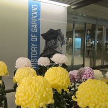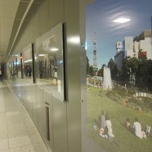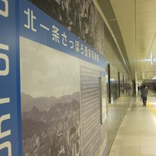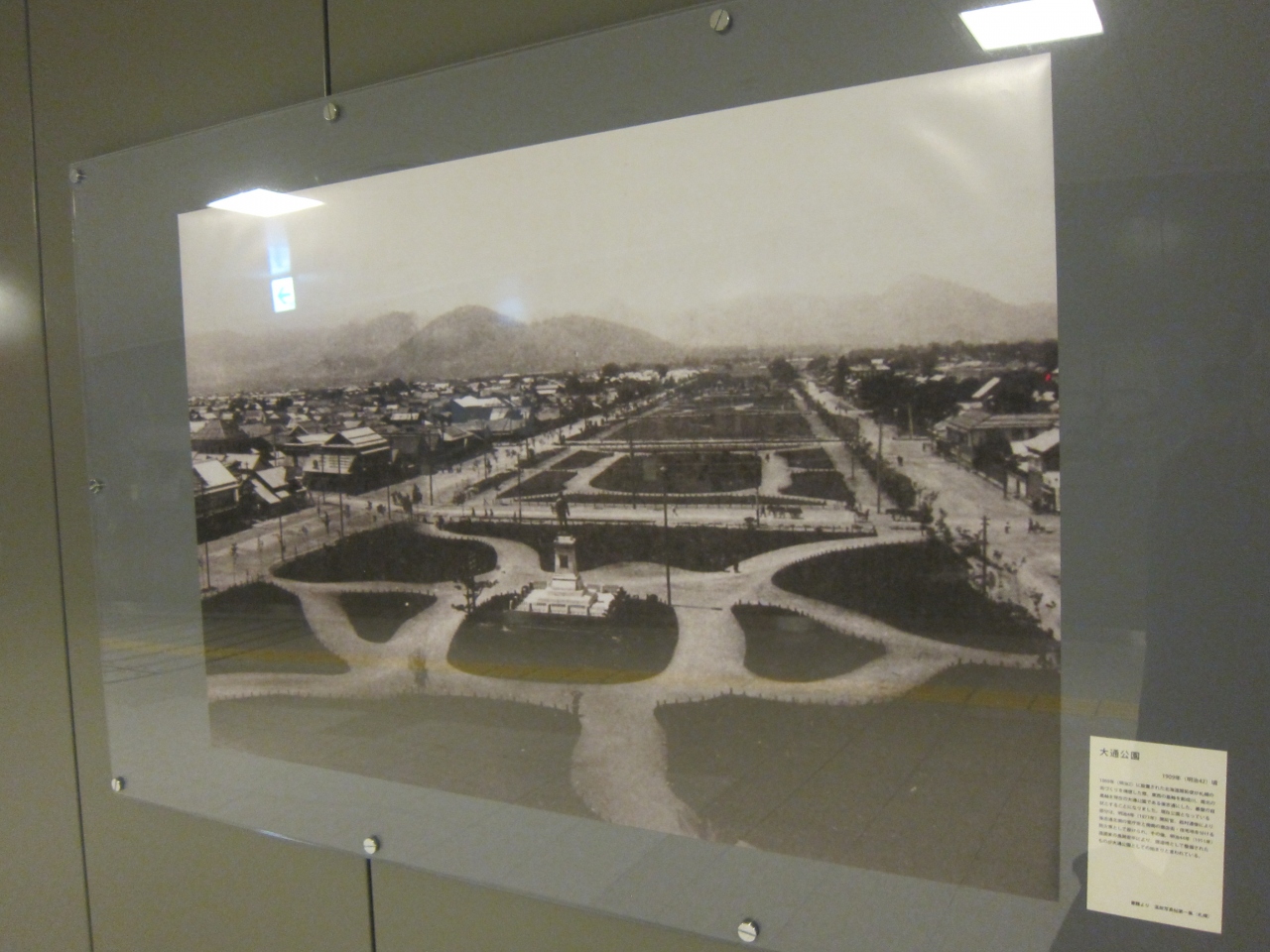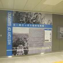 札幌駅と大通公園を結ぶ地下歩道「チカホ」から、北1条の通りを横に伸びる地下道の壁に写真が展示されています。昔の札幌の風景を展示していて、さっぽろ歴史写真館と題していますが、数枚しかなく、さっぽろ歴史写真館と称するにはちょっと規模が少ないと思います。なお、写真のうち1枚に昔の大通公園を写したものがありました。今と違って建物は低く、広々としていて遠くの山並みもよく見えて面白いなと思いました。