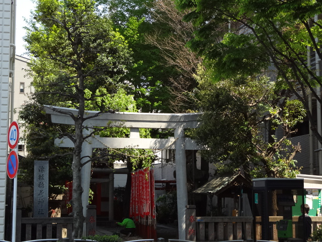 都会の片隅、ビルの隙間に小さな鳥居と何本もの幟。良くある光景ですが、印象に残りました。