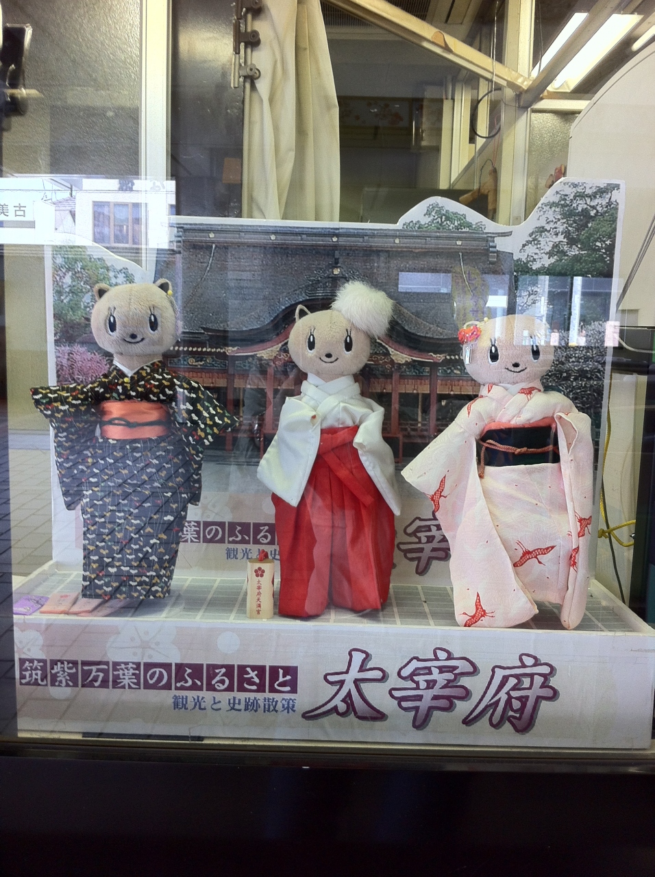 改札を通り過ぎるとき、駅員室のほうを見るとnimocaが三匹、大宰府らしい衣装をきて尾で迎えしてくれていまいした。とてもかわいかったです。